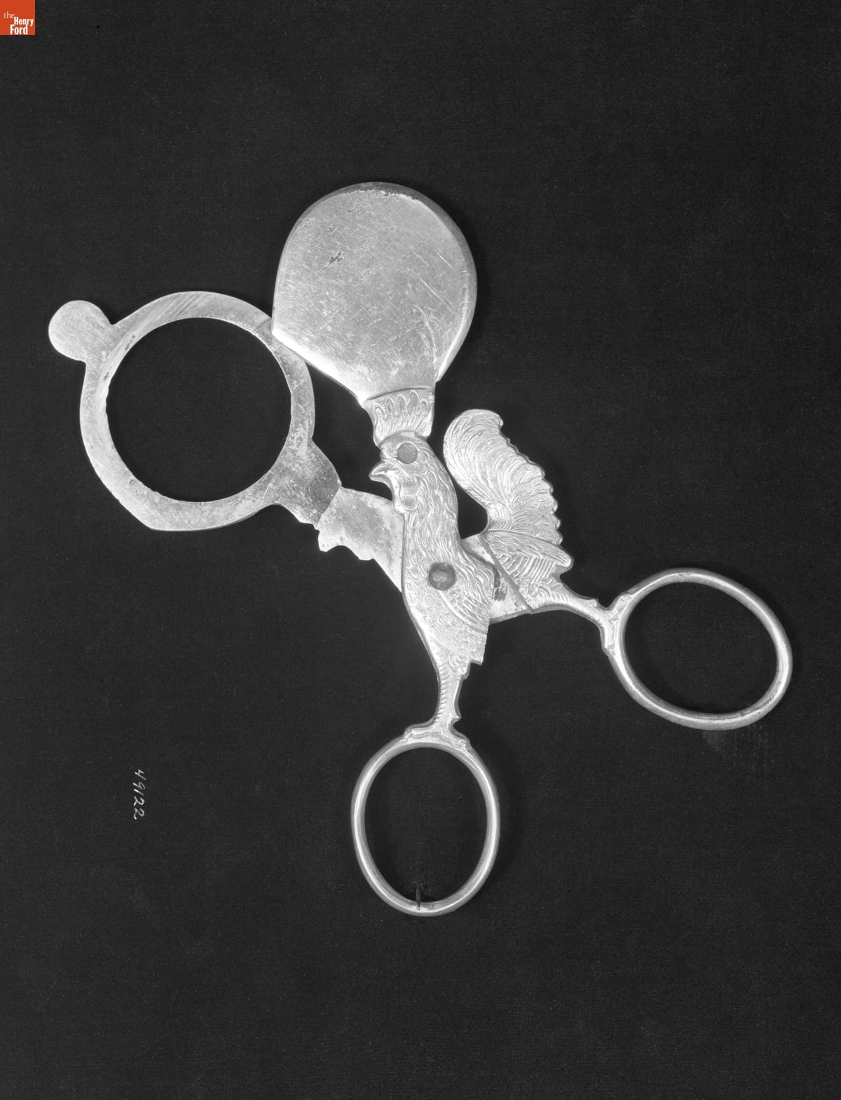 Decorative--and useful--this chicken-themed egg slicer was used for soft-boiled eggs served at the breakfast table. Scissor-like, it cut through shells to remove the top of the eggs as they stood upright in egg cups. Soft-boiled eggs delivered tender egg whites and liquid yolks.