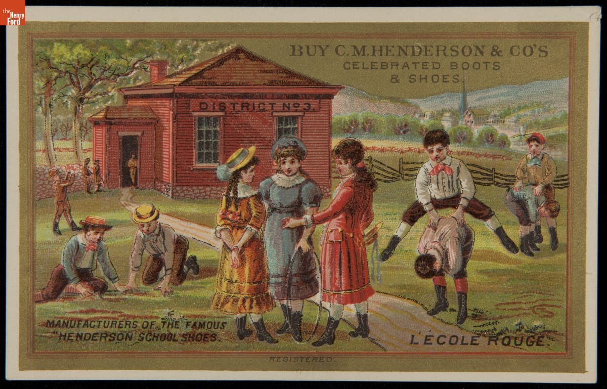 Trade cards were advertisements found in product packages or distributed by local merchants. This trade card offers a glimpse of a rural schoolyard and the students' recess activities. Girls talk, while one holds a hoop toy. Boys play leapfrog and perhaps jacks on the grass. Note that the children are not closely supervised.