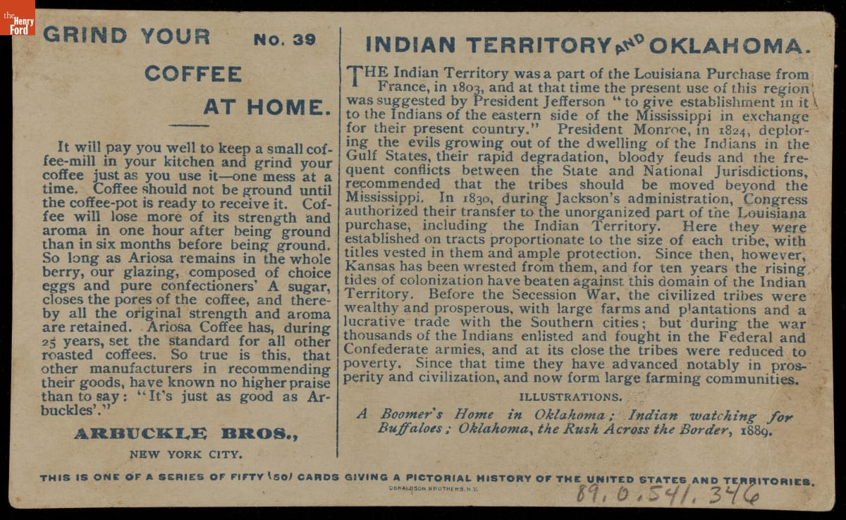 Trade Card for Ariosa Coffee, Arbuckle Bros., "Indian Territory and Oklahoma," 1892