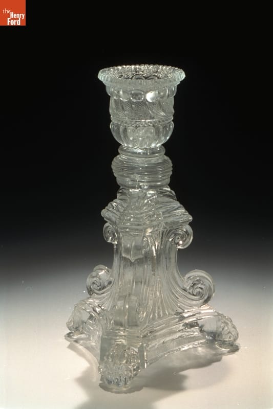 Nineteenth-century American glassmakers experimented with new methods to create products for a growing consumer market. In the 1820s, pressing glass into metal molds by machine was perfected, and by the mid-1800s, manufacturers were creating a variety of inexpensive pressed glass housewares. America's middle-class consumers could now decorate their homes with attractive glass bowls, creamers, dishes, plates, vases, and even candlesticks.