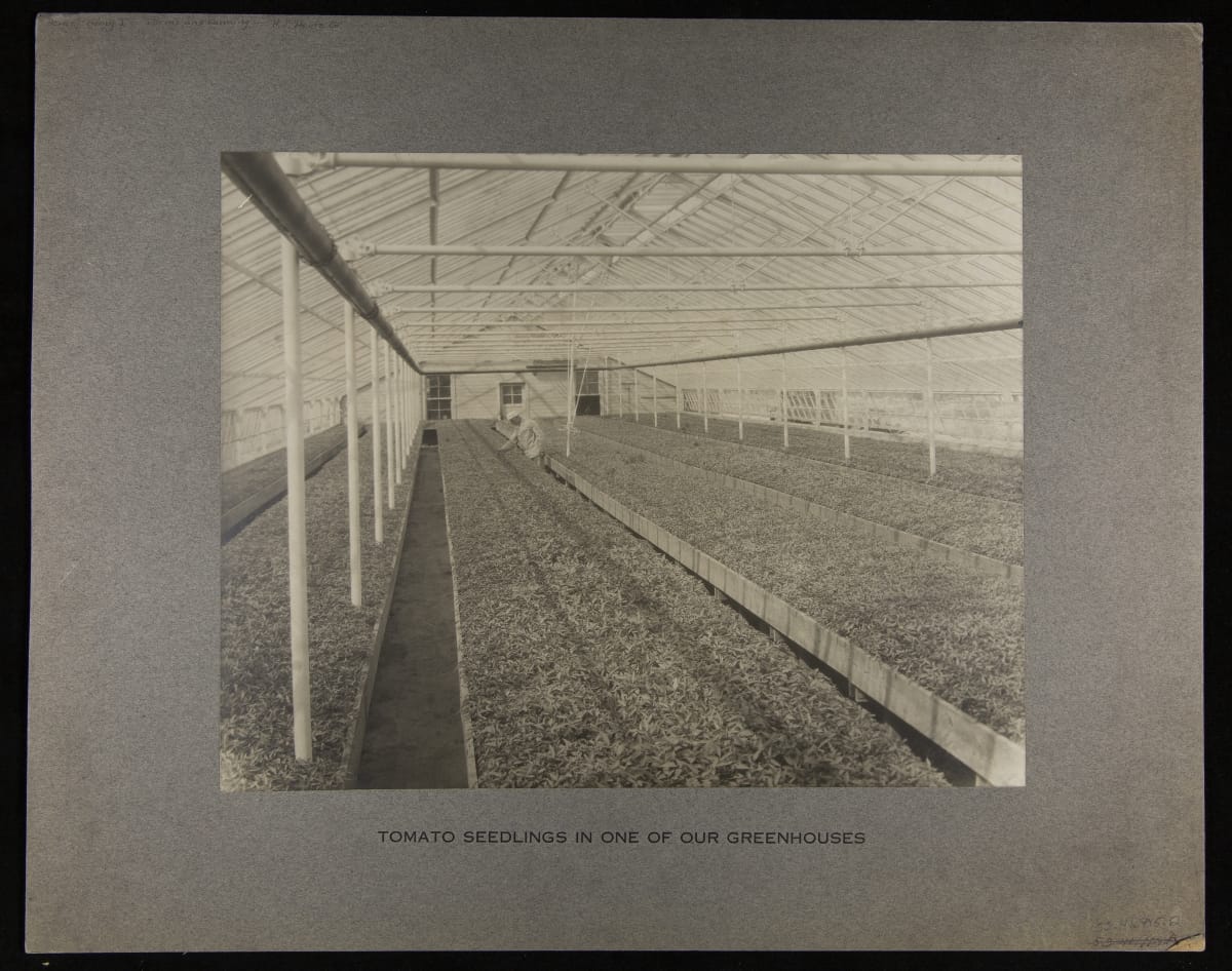 written on front mat: Tomato Seedlings in one of our Greenhouses