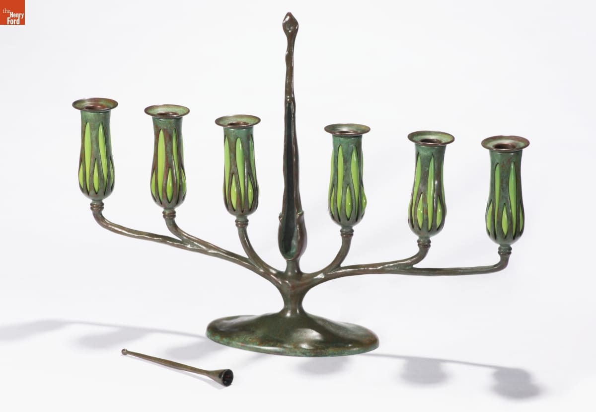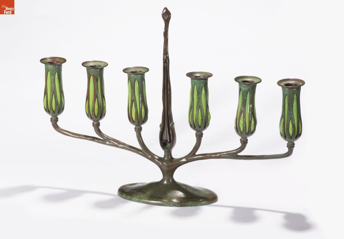 Tiffany Studios made a great variety of candleholders for upper middle-class clients, this model is described in the 1906 catalogue as simply "6 lights, in a row, extinguisher on stem." The customer could choose from 11 designs of "candlestick tops" or standard interchangeable sockets that were listed and priced separately. These included "long" or "short" metal or glass-and-metal tops in a variety of forms.