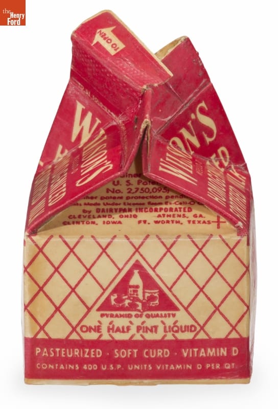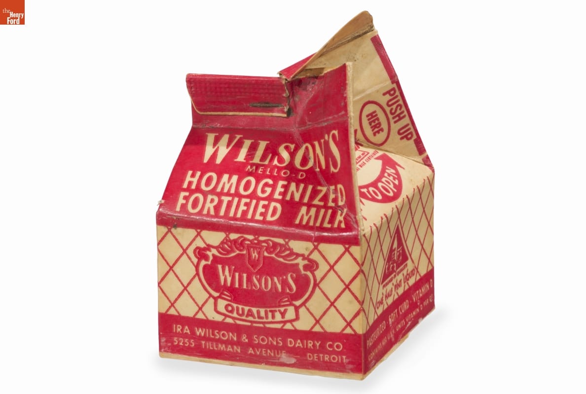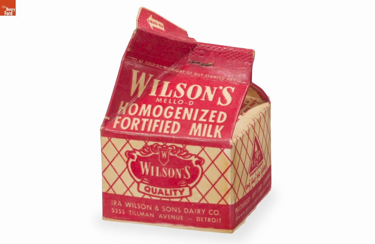 on proper left and right sides: MONDAY / TO BE SOLD BY MIDNIGHT OF DAY STAMPED ABOVE / WILSON'S MELLO-D HOMOGENIZED FORTIFIED MILK / WILSON'S QUALITY / IRA WILSON & SONS DAIRY CO. / 5255 TILLMAN AVENUE DETROIT on front: SPOUT PURE-PAK / (c) IR-[?] & SONS DETROIT MICH / YOUR PERSONAL MILK CONTAINER / TO OPEN / PYRAMID OF QUALITY / ONE HALF PINT LIQUID / PASTEURIZED SOFT CURD VITAMIN D / CONTAINS 400 U.S.P. UNITS VITAMIN D PER QUART