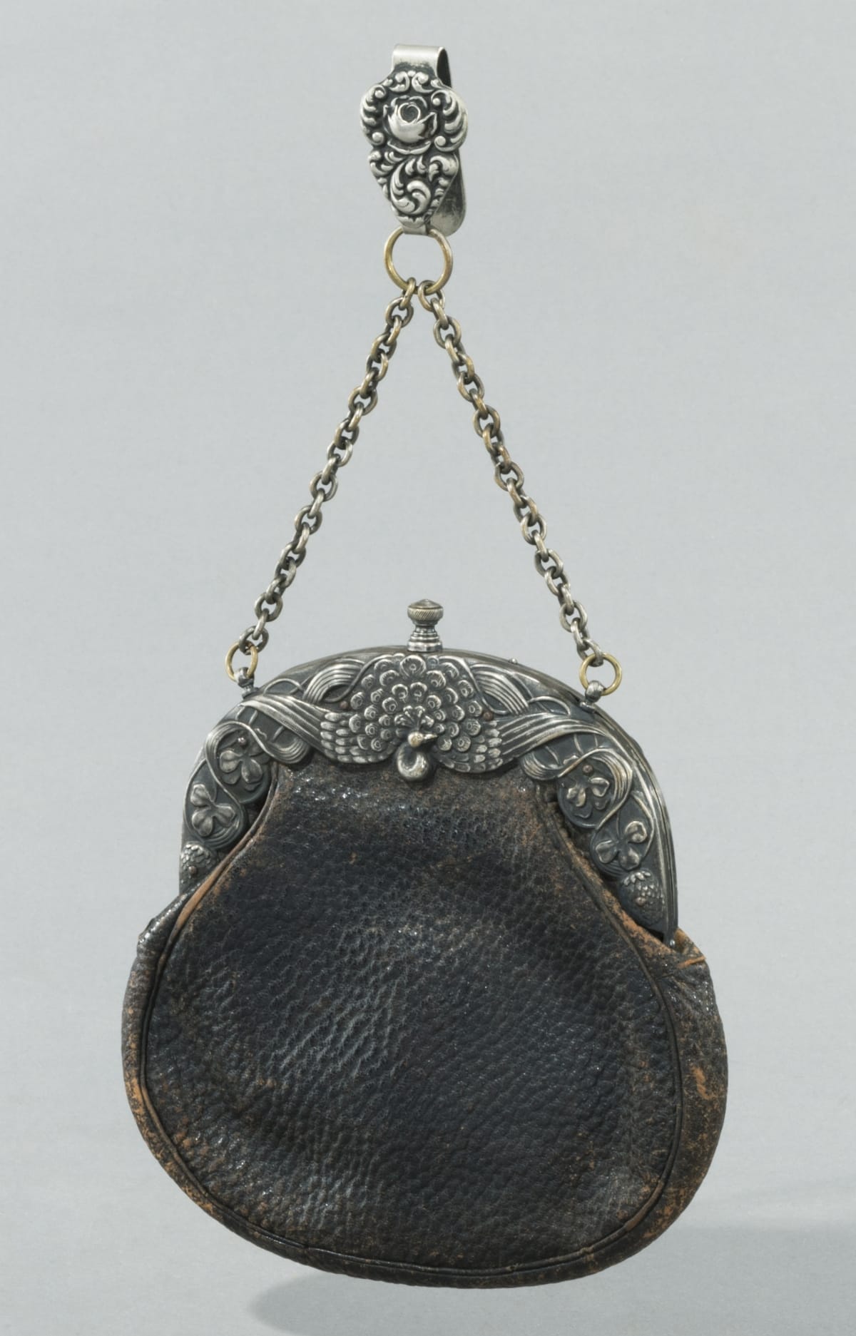 By 1900, well-heeled consumers could choose from an array of luxury goods in the popular Art Nouveau style. This handbag features characteristic Art Nouveau motifs: botanical elements, curved lines, and a peacock, whose fanned tail feathers dominate the center of the design.
