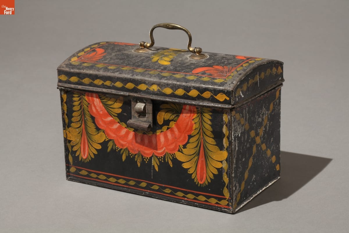 Any American involved in business in the early 1800s would have used a document box to carry important papers. Though these functional containers weren't fancy, they were nearly always decorated. This showy, crudely painted example reflects the importance of classical antiquity to early nineteenth-century Americans. Its "classic" swags and garlands signified the rebirth of democracy and representative government in the young republic.