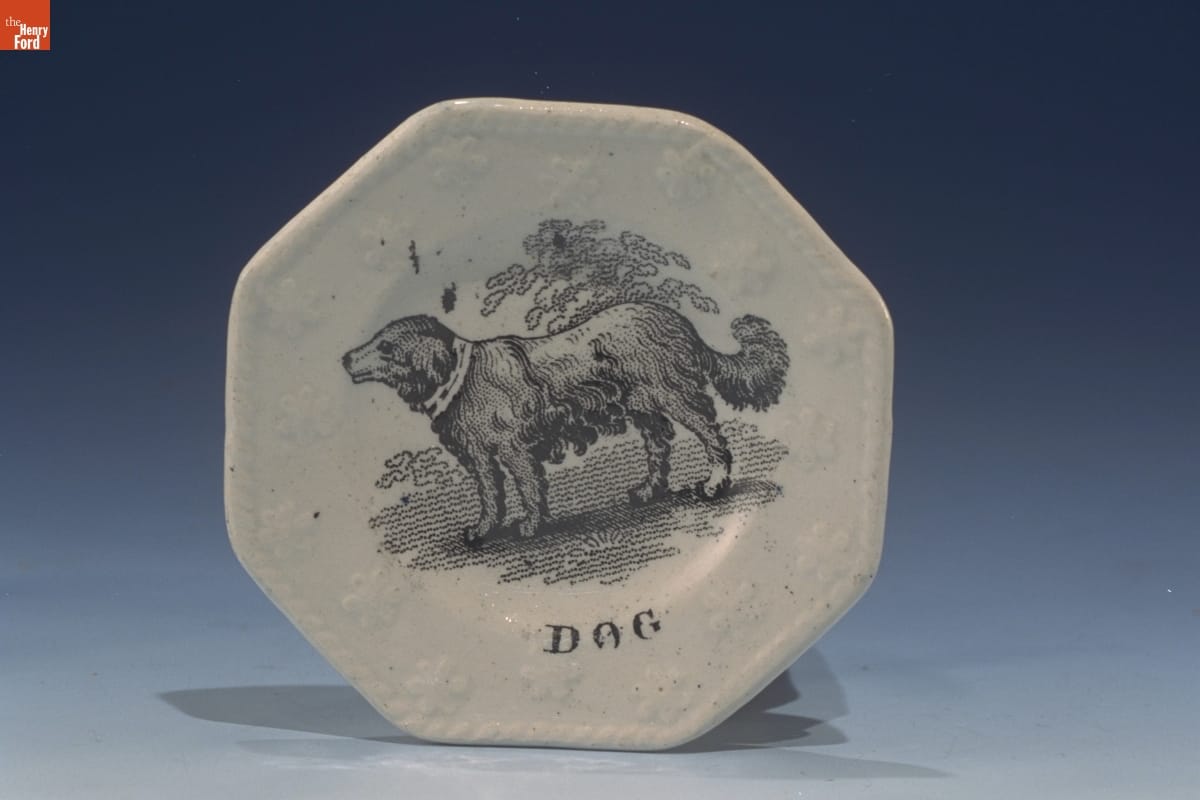 The use of earthenware increased during the mid-nineteenth century as the price decreased. Decorative elements included transfer prints that depicted ordinary scenes that appealed to consumers. This small eight-sided earthenware dish, molded, with a rope and floral border, features "Dog" in word and image.