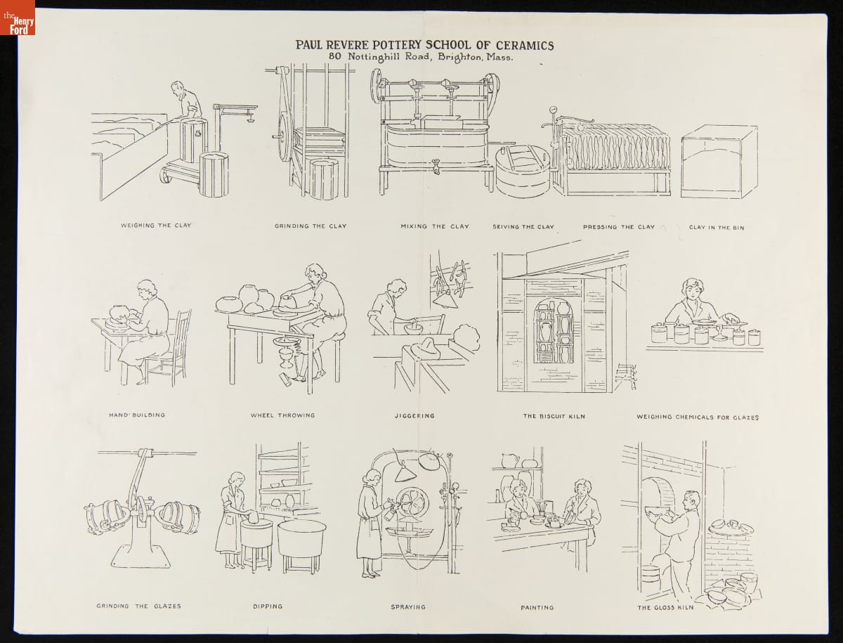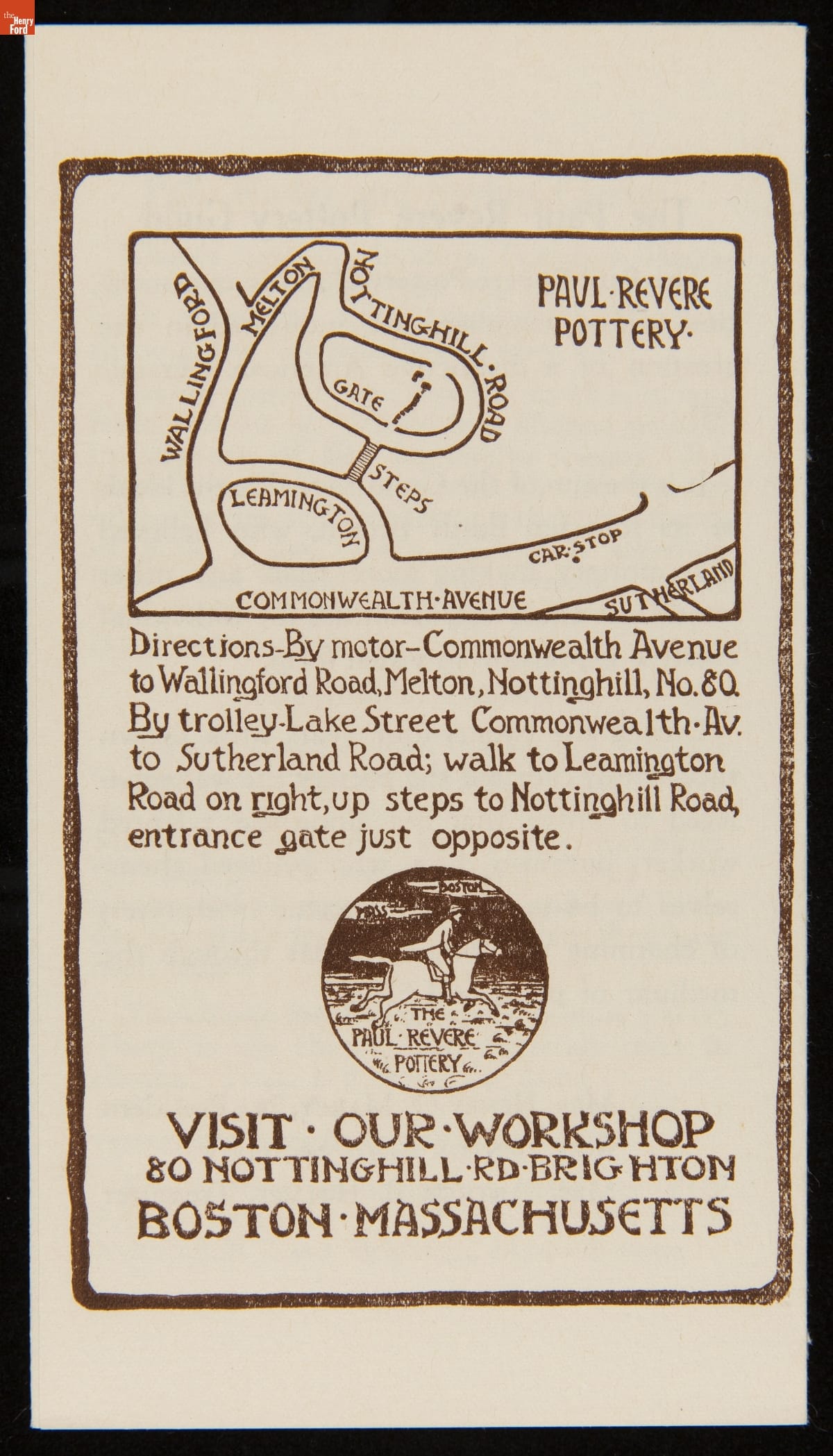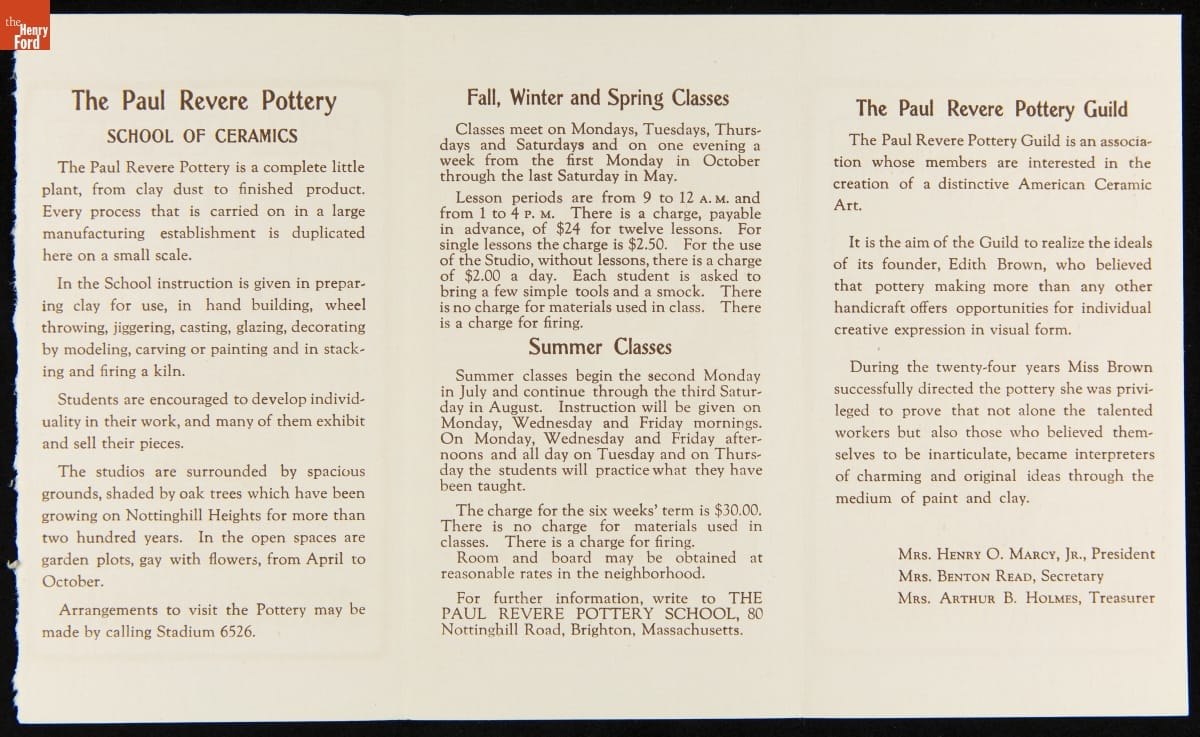 The Paul Revere Pottery evolved from a settlement house founded in 1899 to help women in Boston's North End immigrant community. Founders Edith Guerrier, a librarian, and Helen Brown, an artist, convinced patron Helen Osborne Storrow to fund the pottery in 1906. The venture proved successful, producing remarkable Arts and Crafts wares through the 1930s.