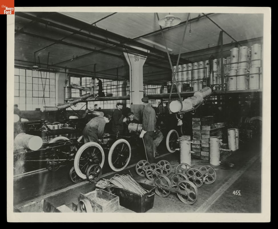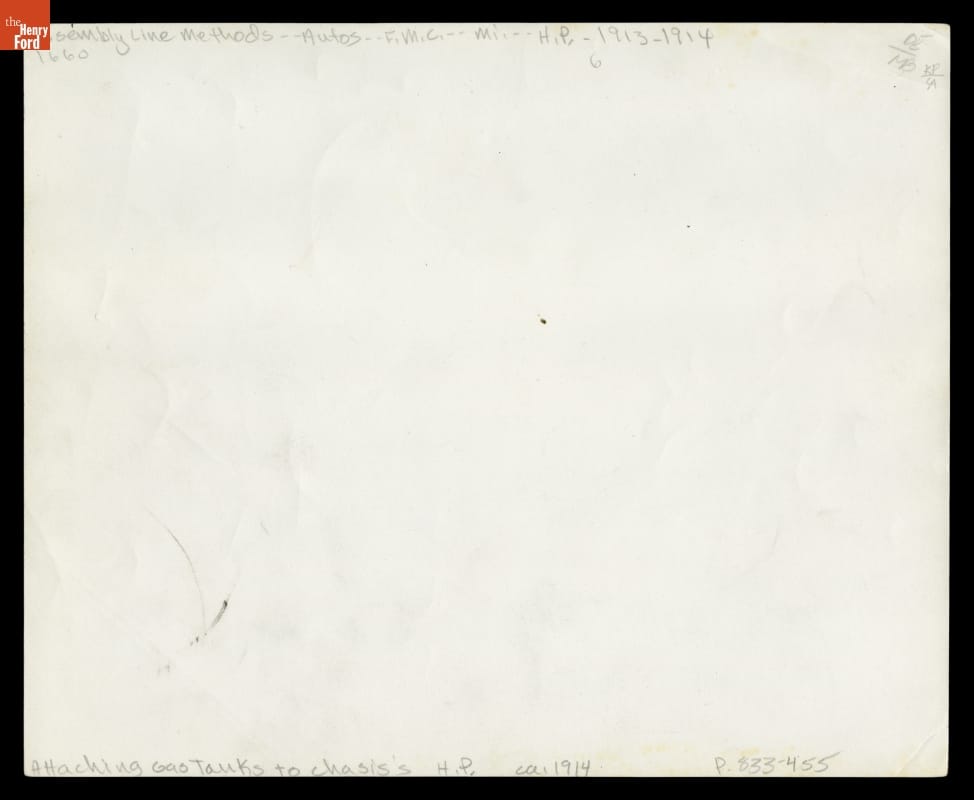 On the chassis assembly lines, frames, axles, gas tanks, engines, dashboards, wheels, radiators, and bodies came together in that order to produce finished, running automobiles. Workers install gas tanks sliding down from the overhead platform to the assembly line. Tanks contain a gallon of gas so that the Model T cars could be started at the end of the line. …