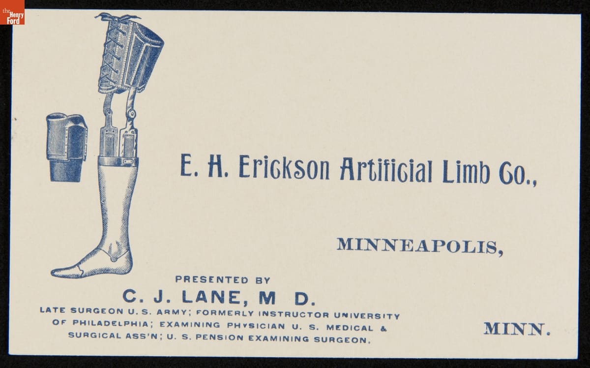 Trade Card for the E. H. Erickson Artifical Limb Company, 1893-1917