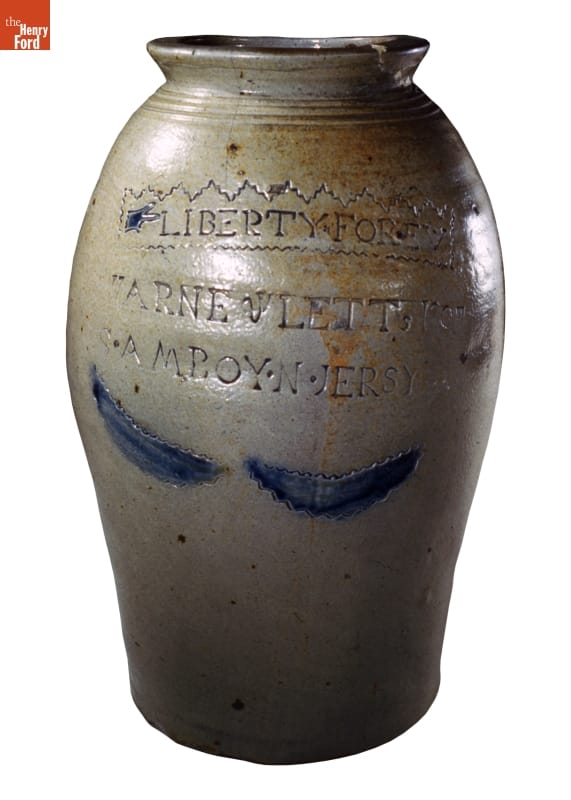 This jar was made of a durable, leak-proof pottery called stoneware. The orange-peel-like outer glaze was created when the potter threw handfuls of common rock salt into a white-hot kiln during the piece's firing. Salt-glazed stoneware pieces were decorated with an array of designs, including the inscription, "LIBERTY FOREV" (probably implying "Liberty Forever"), on this piece.