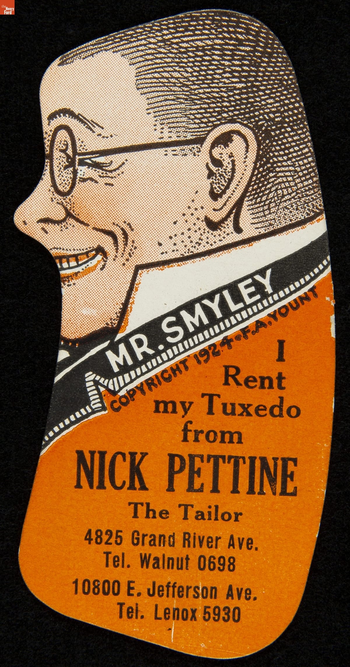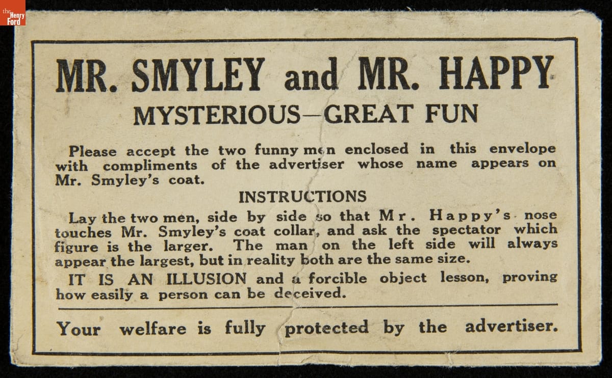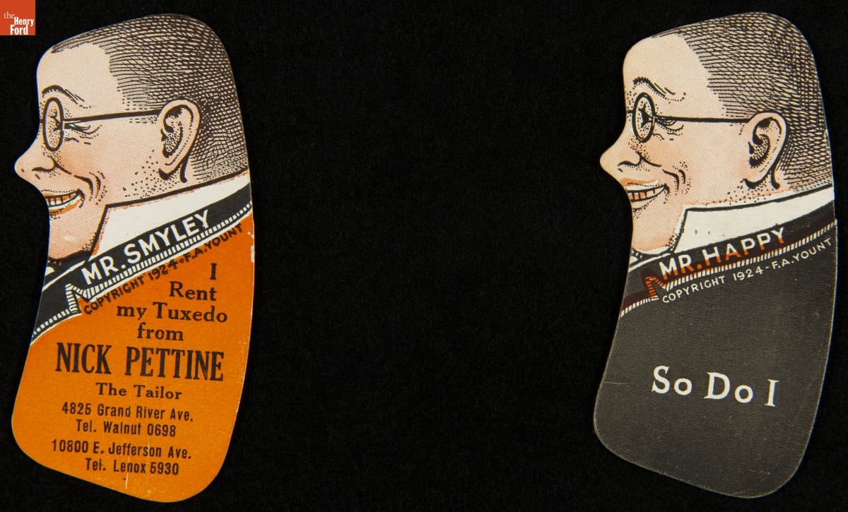 Mr. Smyley and Mr. Happy's Optical Illusion Trade Card for Nick Pettine Tuxedo Rentals, 1924