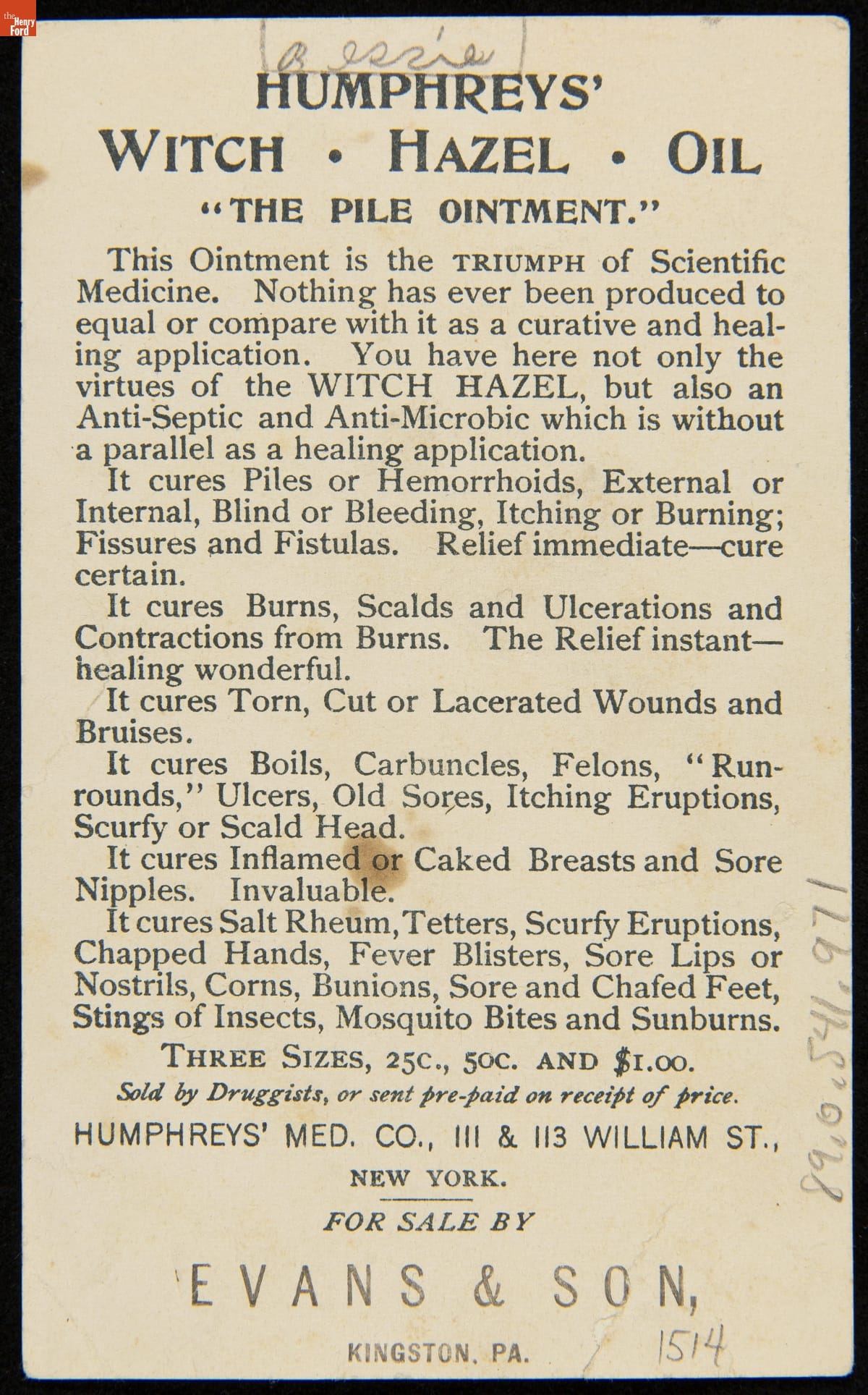 Trade Card for Humphrey's Witch Hazel Oil, Humphrey's Med. Co., 1870-1900