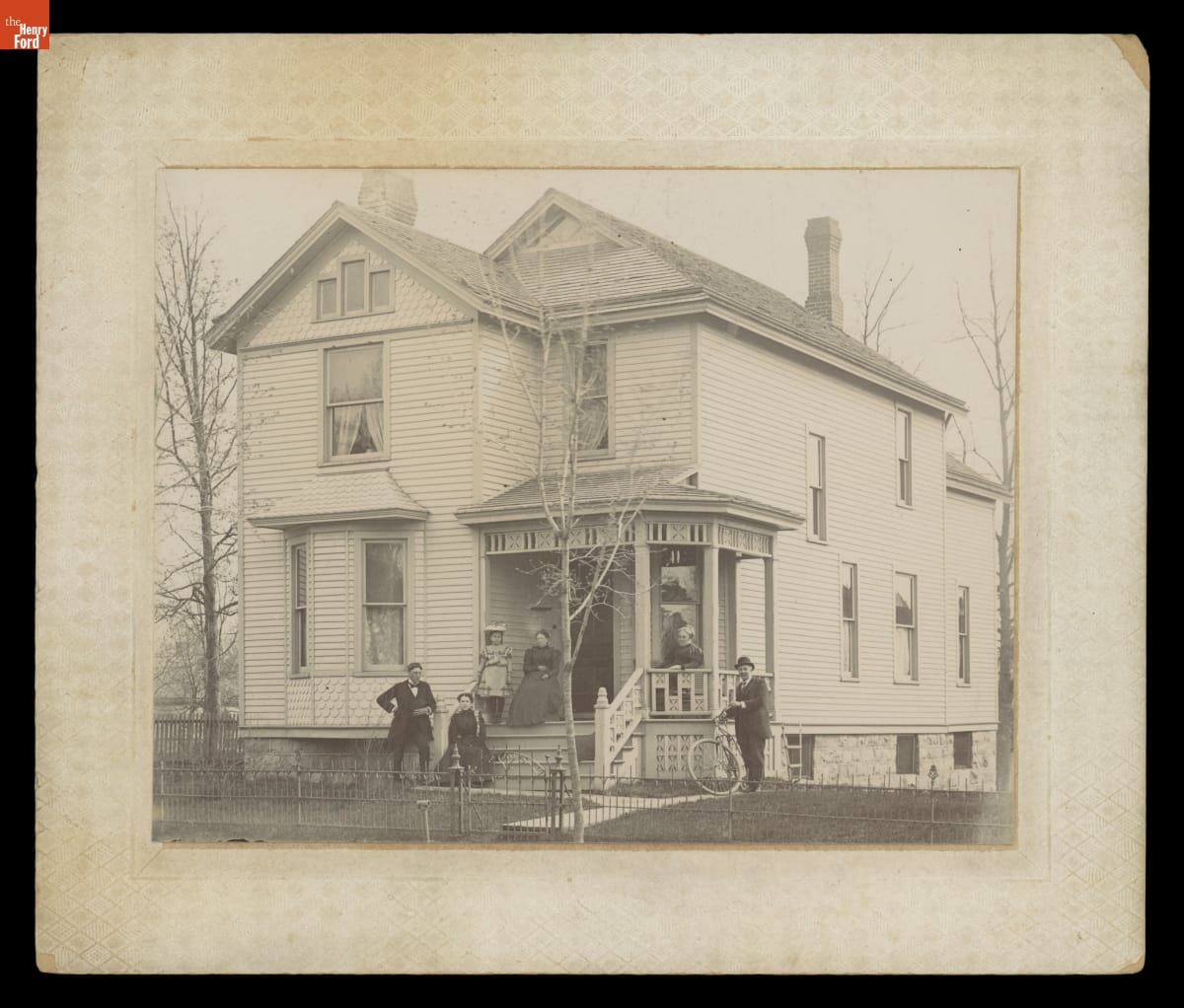 By 1900, the time of this photograph, many house plans included a front porch. Large wraparound porches, or more modest ones like this one, often became a prime location to photograph family and friends. People would proudly dress in their best clothes and show off their material possessions--which might include the bicycle shown here and even the house itself!