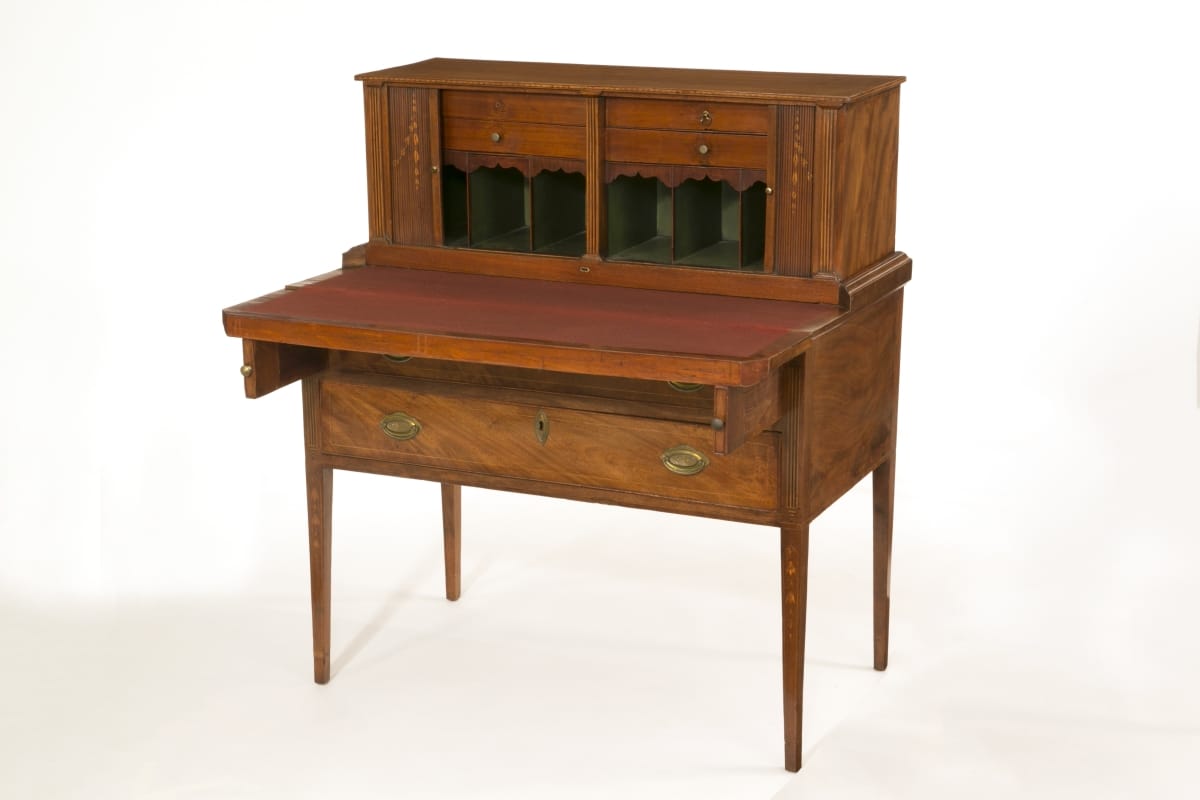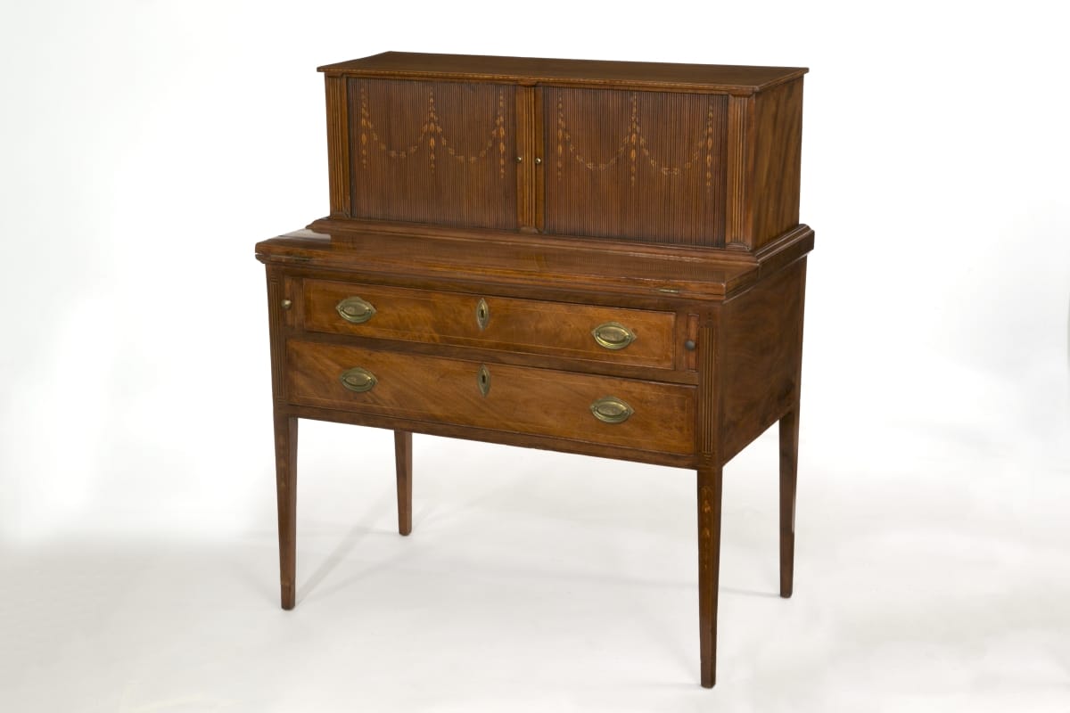 Tambour desks are an American innovation associated with the father and son cabinetmaking team of John and Thomas Seymour. The Seymours emigrated from England in the 1780s, eventually settling in Boston. They are distinguished by reeded tambours, or panels, covering pigeonholes and drawers, much like later roll-top desks. Combining small size and delicate proportions, Tambour desks were intended for use by women, for correspondence and addressing invitations.