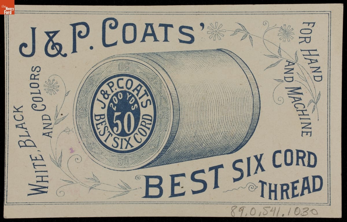 As color printing gained momentum in the late 19th century, trade cards became a major means of advertising goods and services. Americans enjoyed and often saved the little advertisements found in product packages or distributed by local merchants. This trade card advertises Six Cord Thread from J. & P. Coats Company.