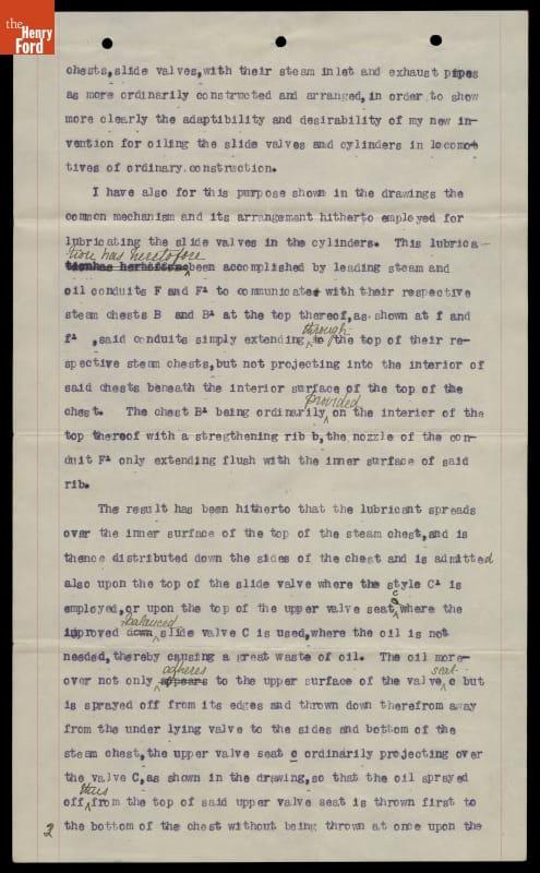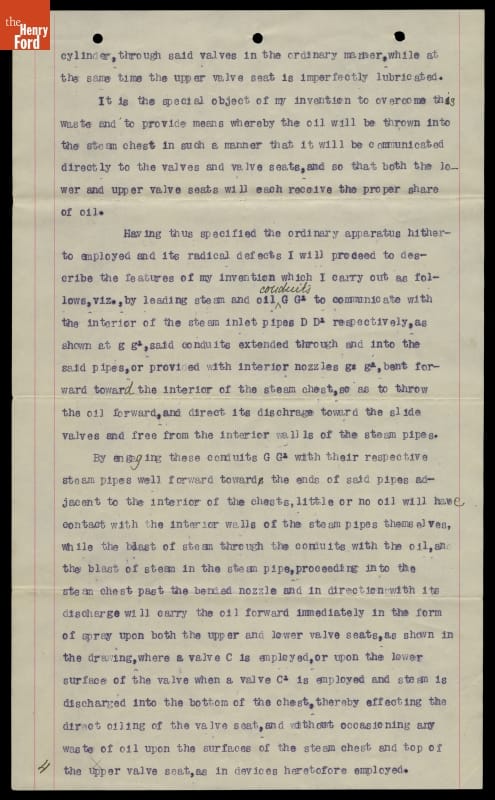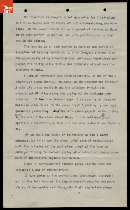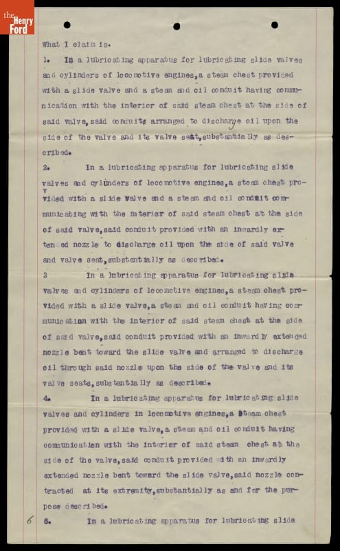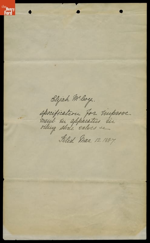 Canadian-American inventor Elijah McCoy developed a mechanical lubricator to oil the slide valves on a steam locomotive. McCoy's device automatically supplied measured amounts of oil to the valve, reducing the need for crews to lubricate it manually. McCoy received a patent on his invention in 1872. He refined the device many times. This patent is for an 1887 modification.