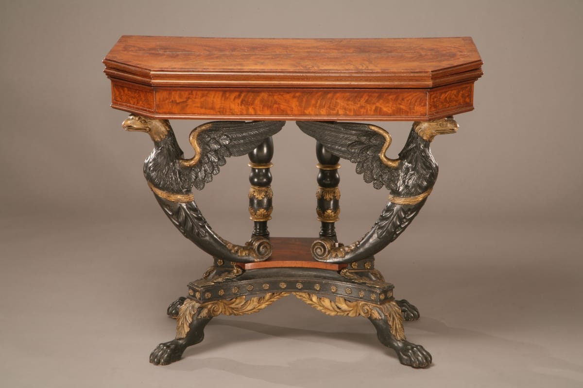 Flip-top game tables were highly desirable objects in early 19th century America. This one is as fancy as they got, complete with carved, winged griffins, and hairy paw legs.