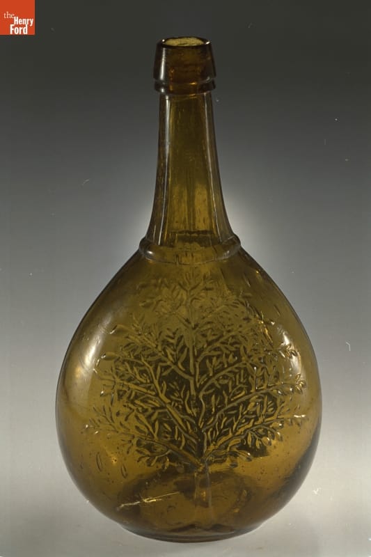 Glass factories in America began producing inexpensive, mold-formed flasks in the early 1800s. These figured flasks often were decorated with symbols of national pride. Other flasks, like this one, contain images of foreign newsmakers. Many Americans embraced Louis Kossuth, a mid-century Hungarian patriot and revolutionist. Kossuth arrived in the U. S. in 1851 after a failed attempt to set up a democratic Hungarian state.