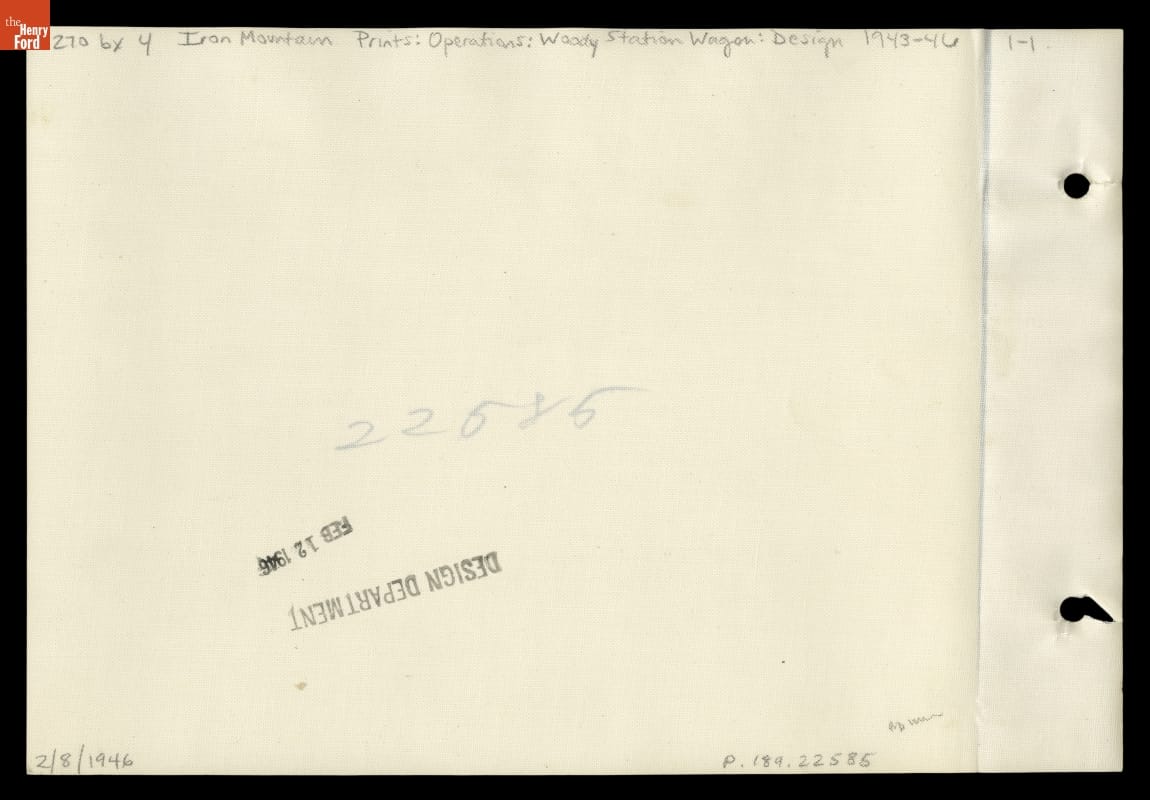 In March 1946, Ford Motor Company sent photographers to its Iron Mountain plant on the Menominee River in Michigan's Upper Peninsula, where workers produced handcrafted station wagon bodies from local hardwood. This photo shows the spare tire carrier and tailgate on what appears to be an early mock-up of the 1949 Ford wagon.