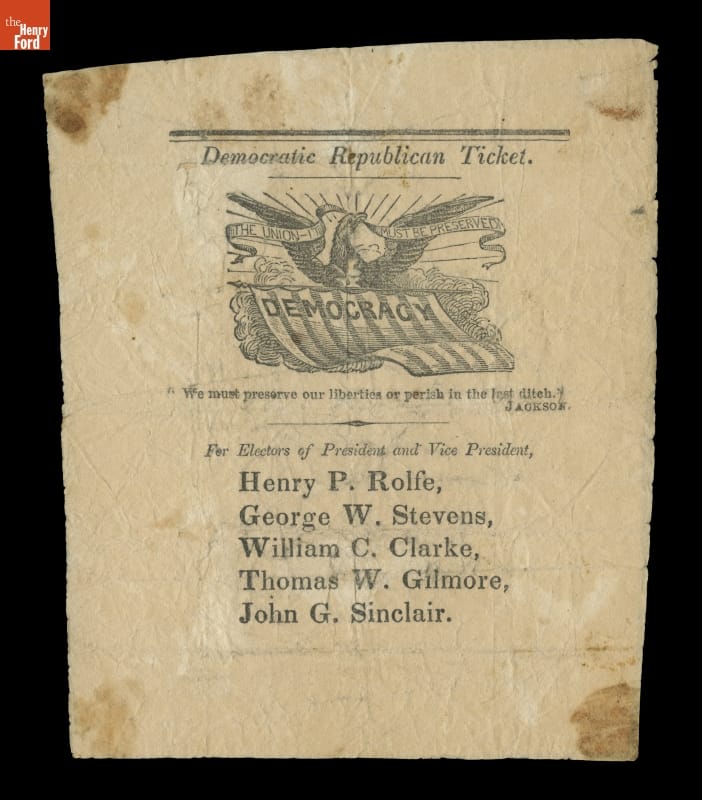 At top: Democratic Republican Ticket/THE UNION MUST BE PRESERVED/ DEMOCRACY/ We must preserve our liberties or perish in the last ditch./ JACKSON...