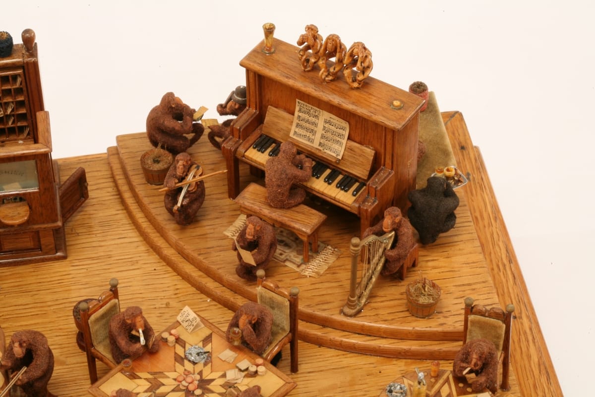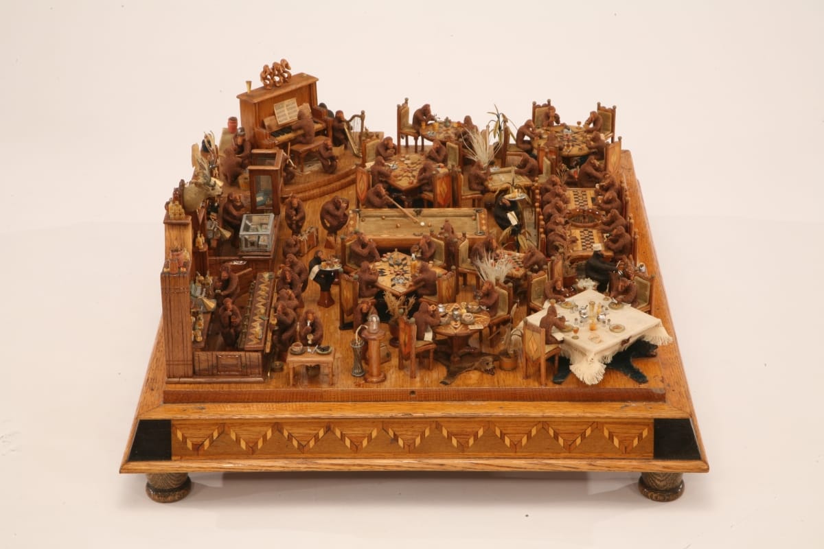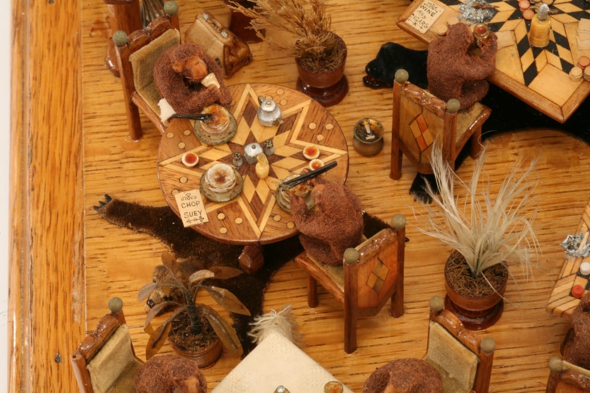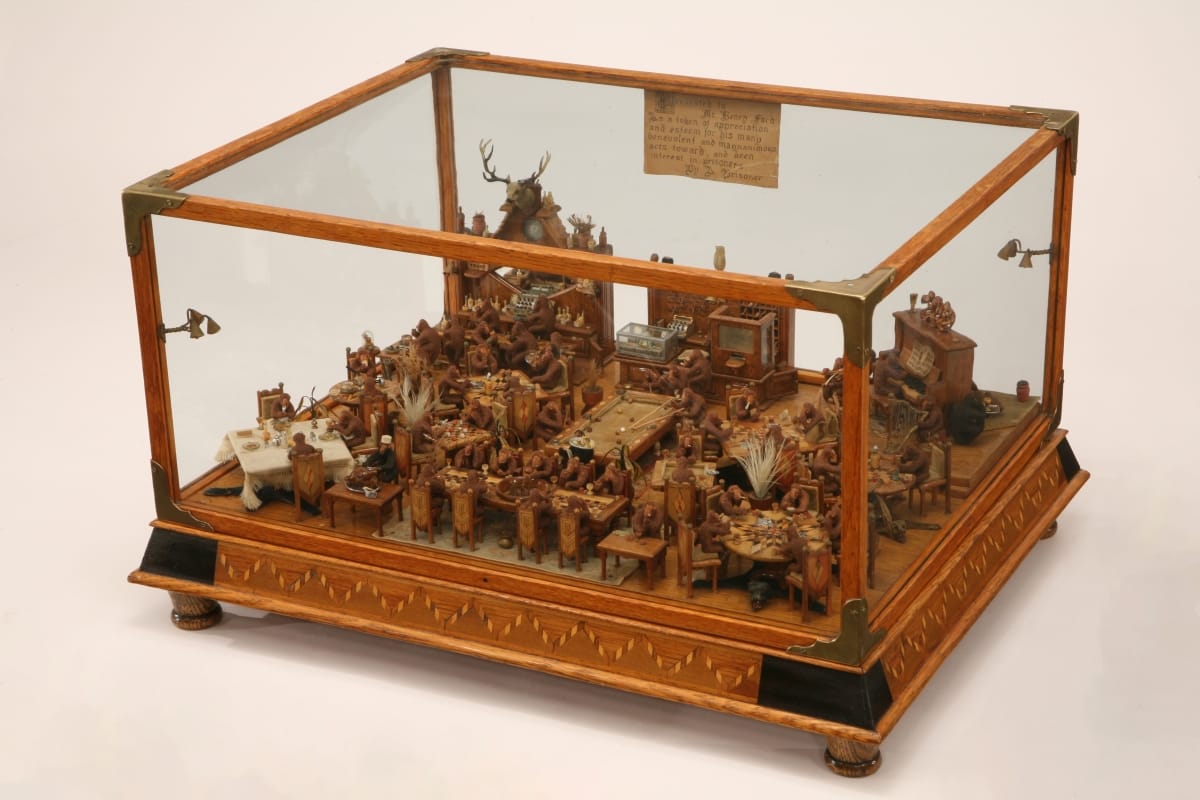 In 1915, Patrick J. Culhane, an inmate at the Massachusetts State Prison, presented this diorama to Henry Ford. Culhane depicted monkeys engaging in activities he believed lead to the downfall of many prisoners, such as gambling and drinking alcohol. Ford, interested in the man who produced this elaborate work, probably secured Culhane's release and gave him a job at the Ford assembly plant in Cambridge, Massachusetts.