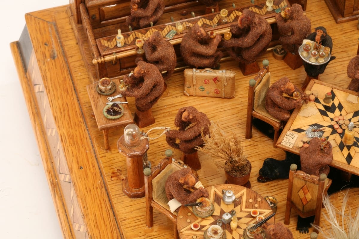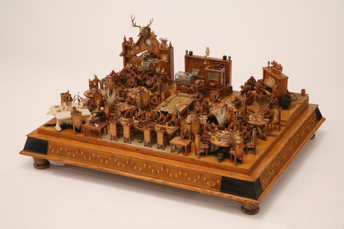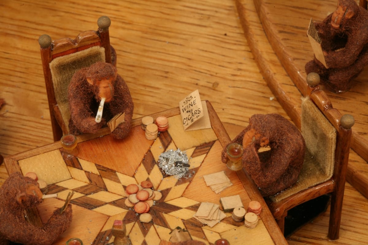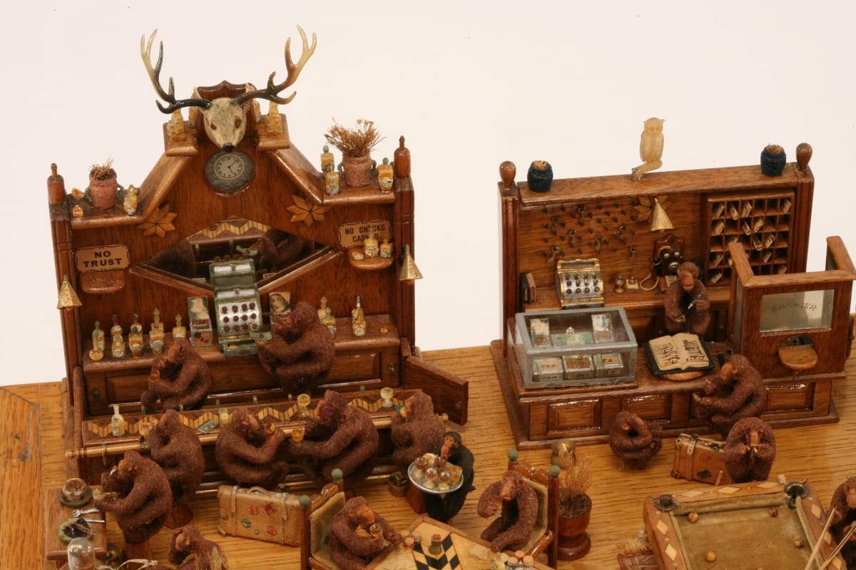 In 1915, Patrick J. Culhane, an inmate at the Massachusetts State Prison, presented this diorama to Henry Ford. Culhane depicted monkeys engaging in activities he believed lead to the downfall of many prisoners, such as gambling and drinking alcohol. Ford, interested in the man who produced this elaborate work, probably secured Culhane's release and gave him a job at the Ford assembly plant in Cambridge, Massachusetts.