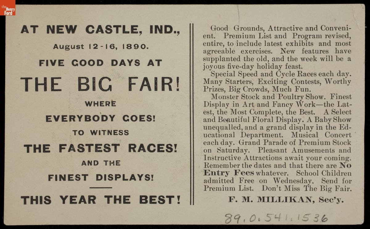 Advertising Card for "The Big Fair," New Castle, Indiana, August 1890