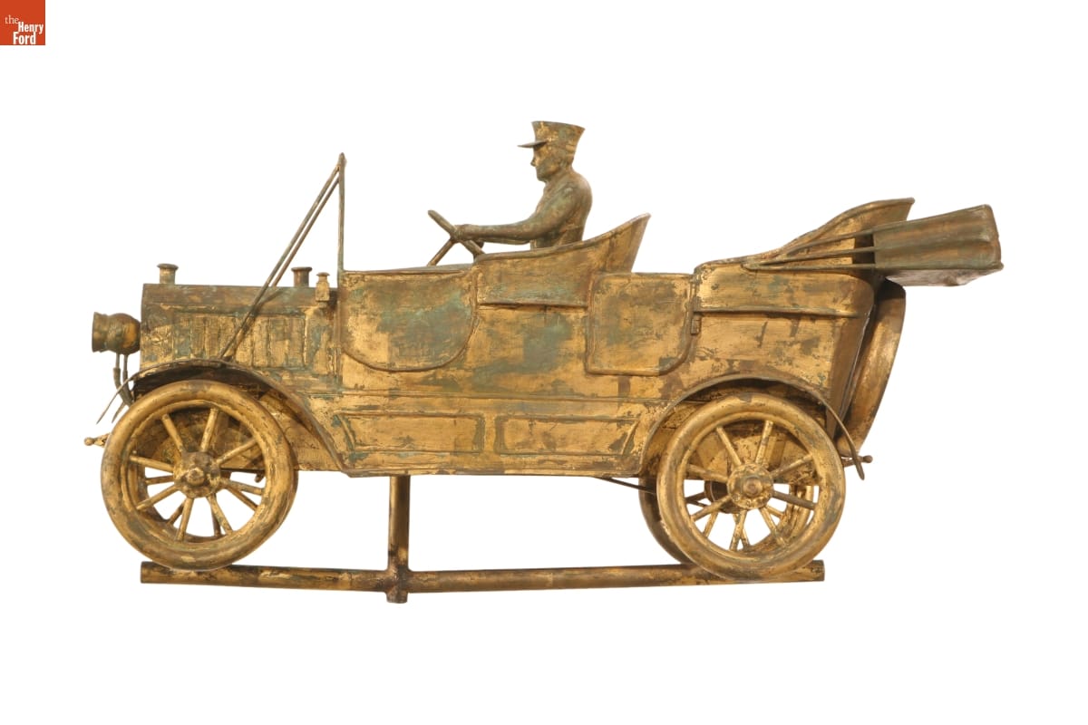 Weathervanes point into the direction of the wind. This helped viewers anticipate weather changes before local forecasts became common after 1920. Functional vanes required a basic pointing device and directional arms, but manufacturers added decorative elements, or ornaments, to appeal to consumer interests. Changing transportation technologies became popular symbols of modernity during the late-19th and early-20th centuries.