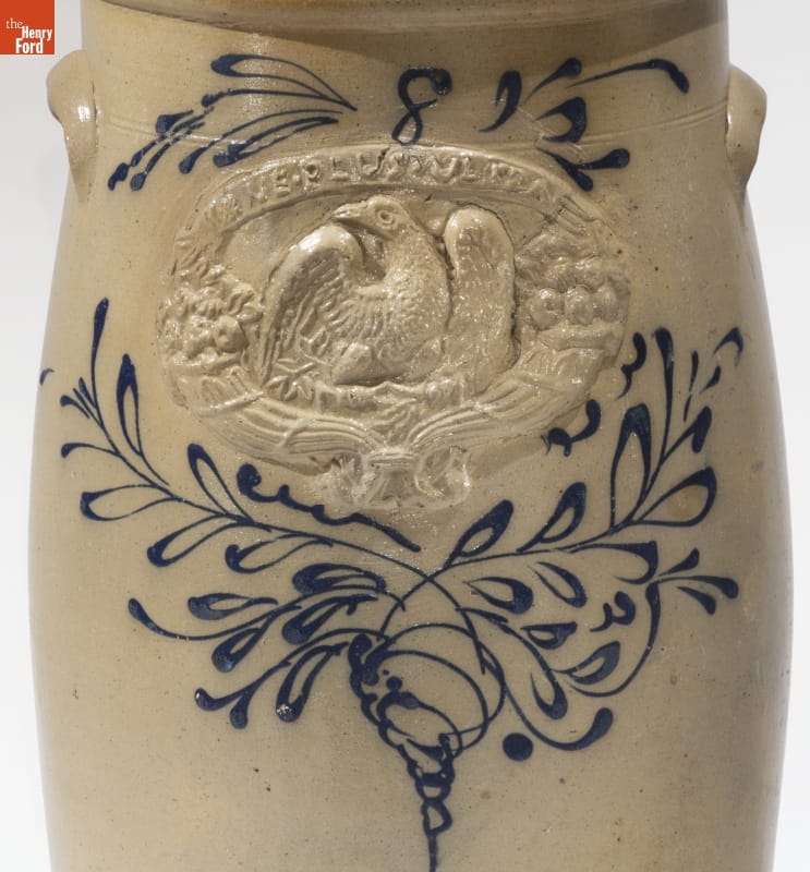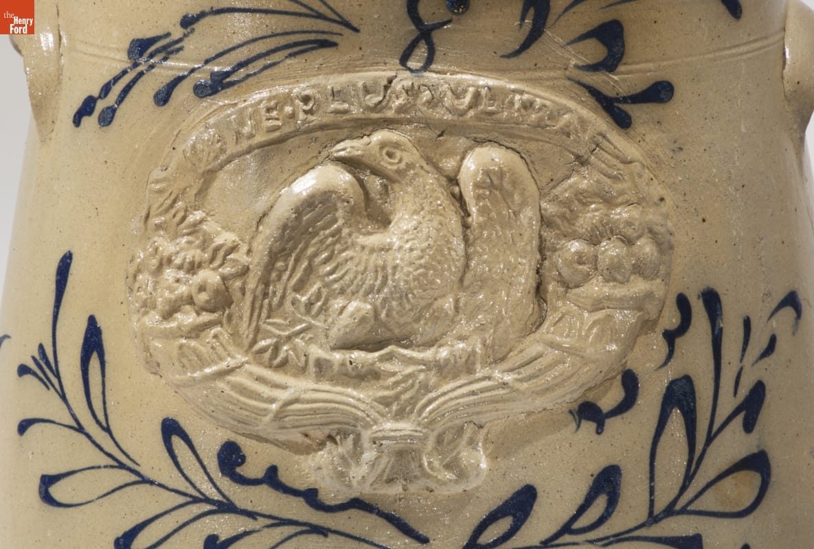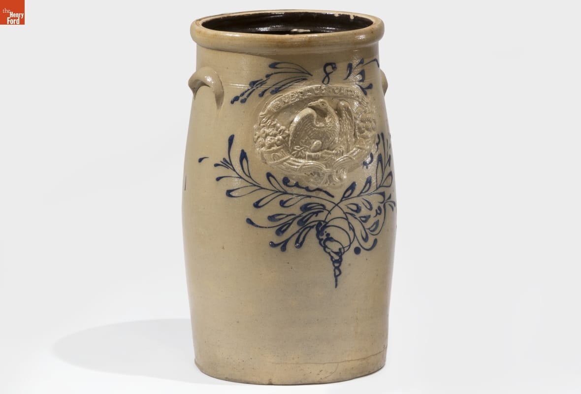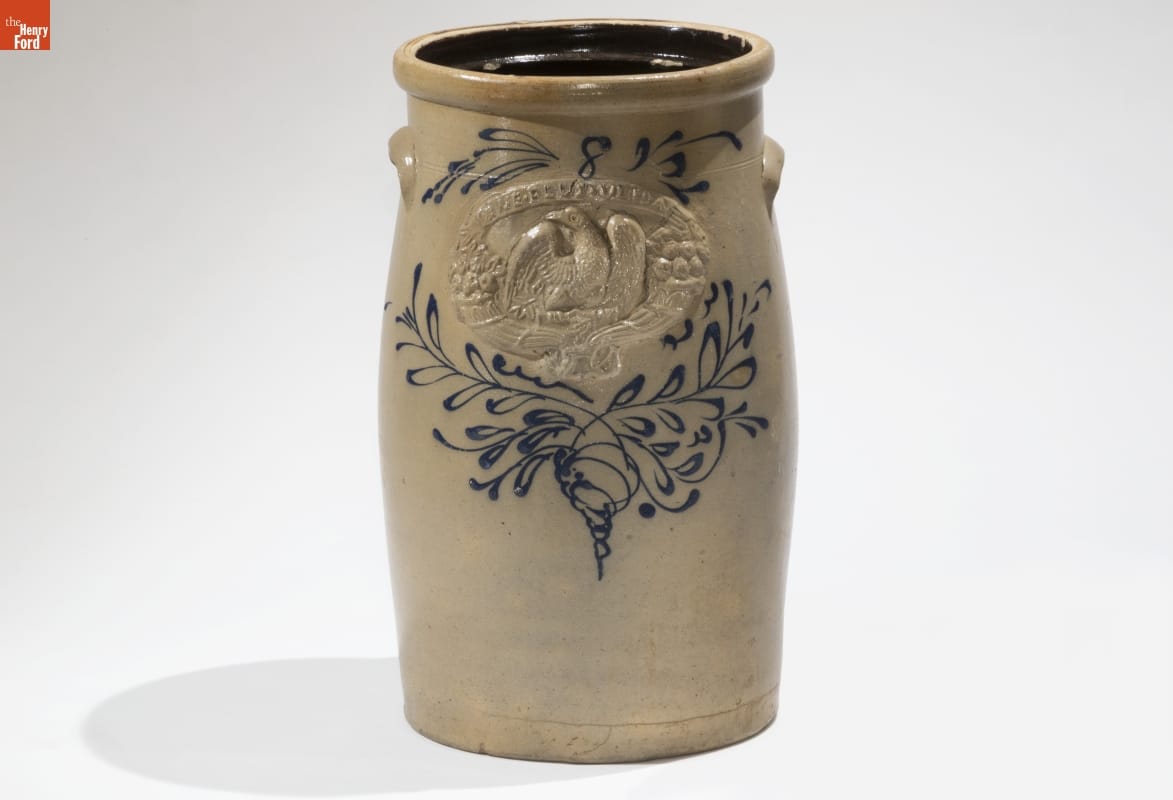 This butter churn was made of a durable, leak-proof pottery called stoneware. The orange-peel-like outer glaze was created when the potter threw handfuls of common rock salt into a white-hot kiln during the piece's firing. Salt-glazed stoneware pieces were decorated with an amazing array of designs, including the eagle and other patriotic motifs molded separately and applied to this piece.
