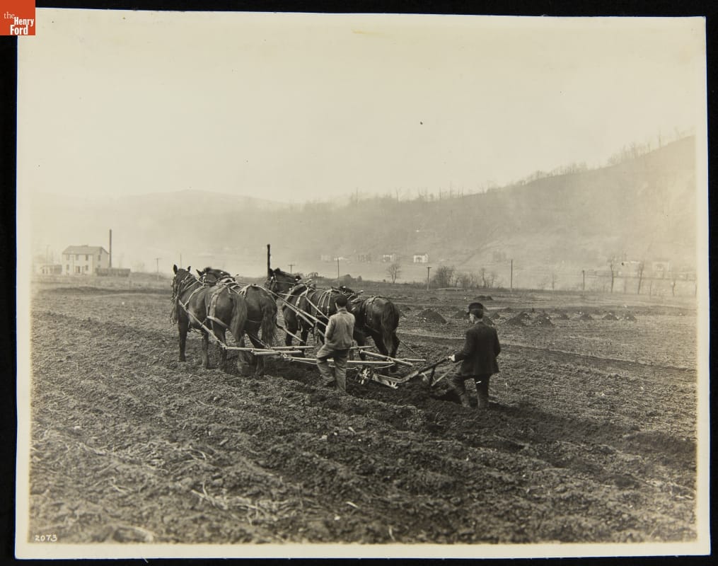 While most people recognize the H. J. Heinz Company for its ketchup, its first product was actually horseradish -- sold out of H. J. Heinz's family home in 1869. Though the product line quickly expanded to include pickled foods, preserves, and condiments, horseradish remained a mainstay for many years. In this photograph, the field is being plowed and prepared for the years' horseradish crop.