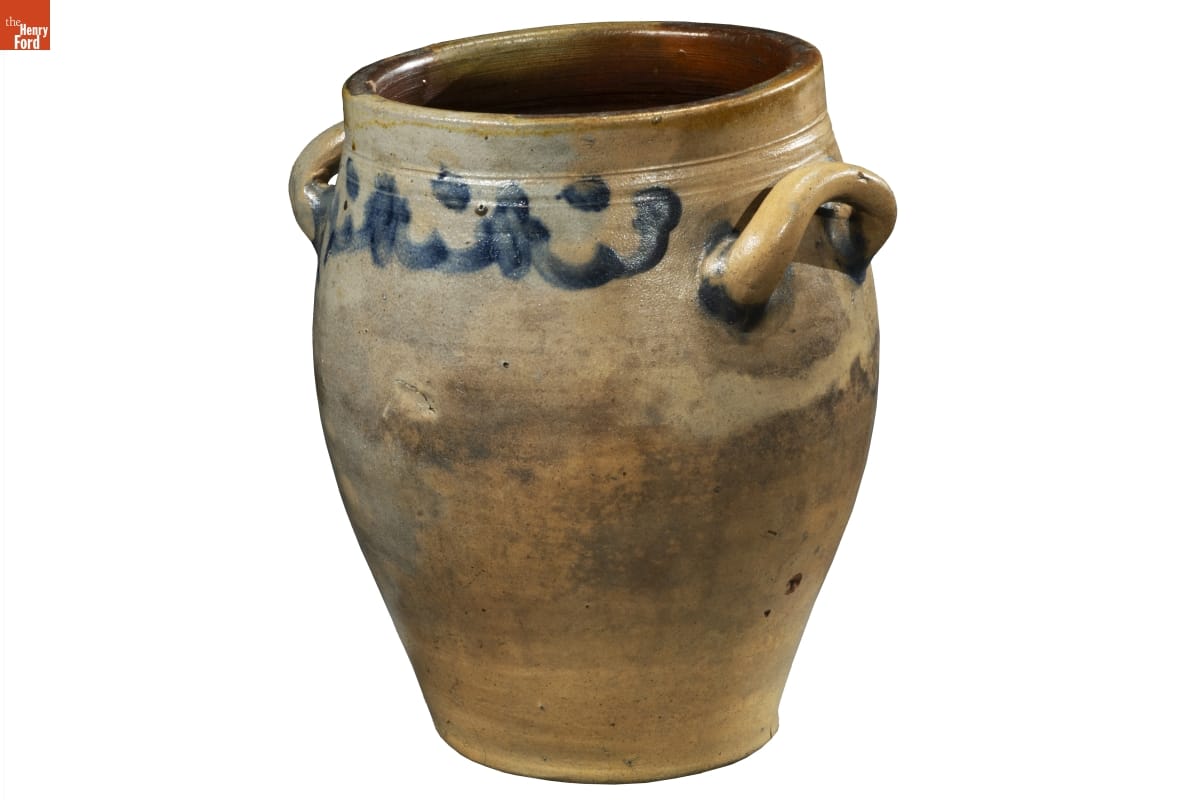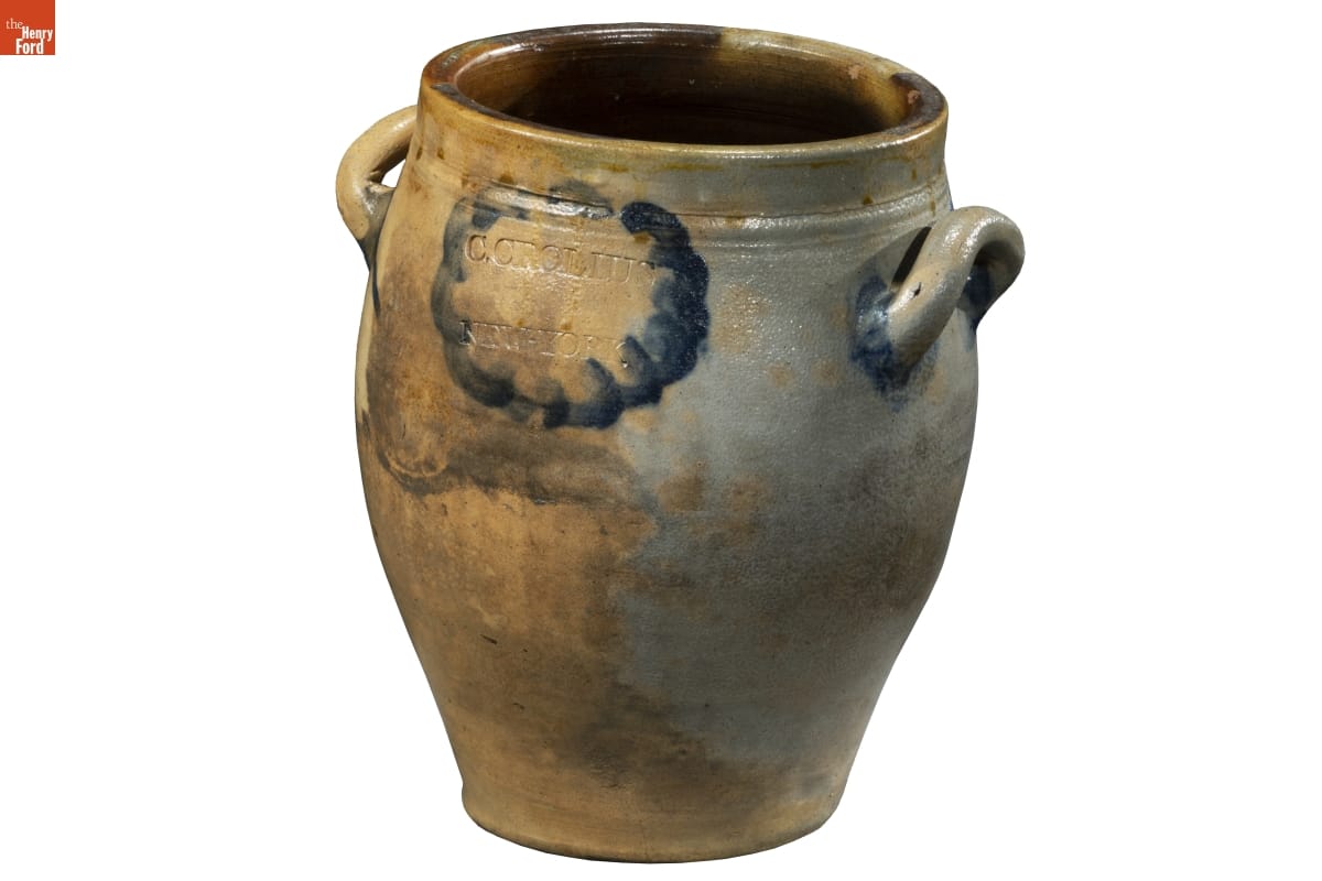 Clarkson Crolius's New York City pottery produced this durable, leak-proof stoneware jar in the early 1800s. Its orange-peel-like outer glaze formed when the potter threw handfuls of common rock salt into a white-hot kiln during the piece's firing. Clarkson Crolius was the grandson of William Crolius, a German immigrant who founded the family pottery businesses in 1730.