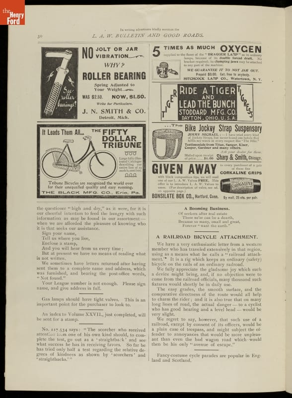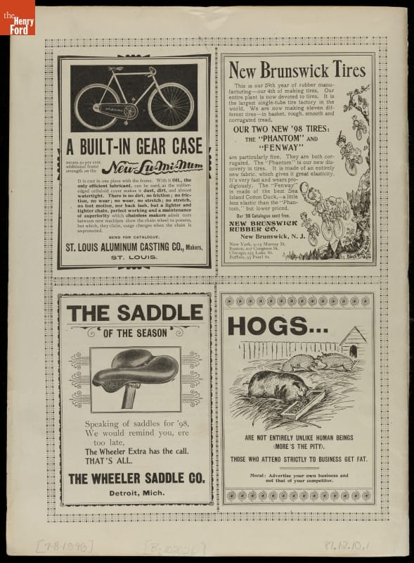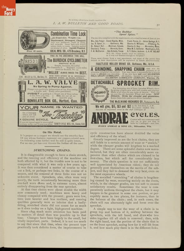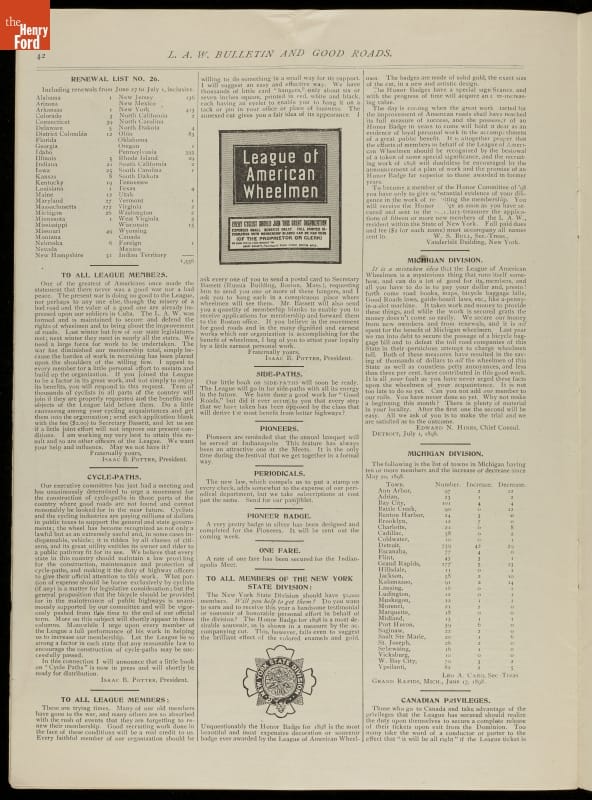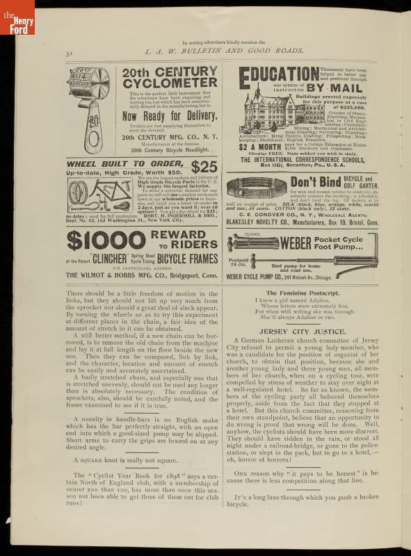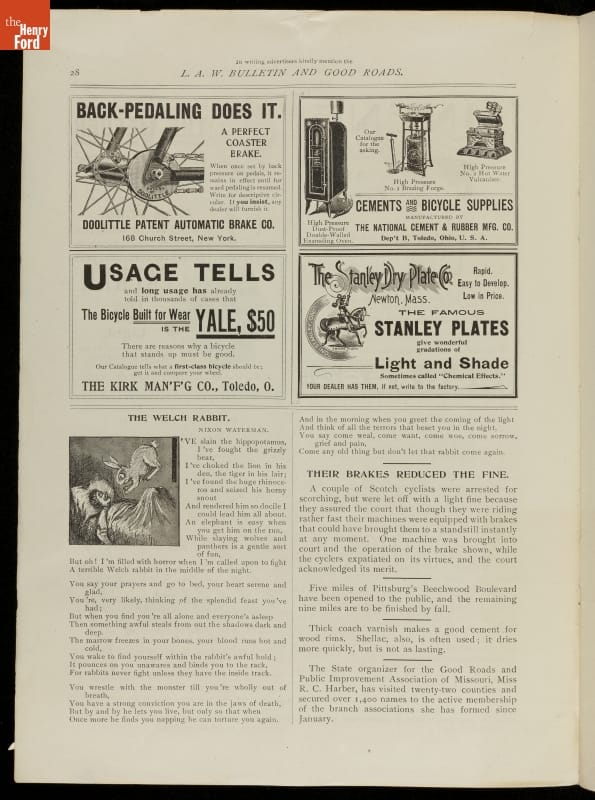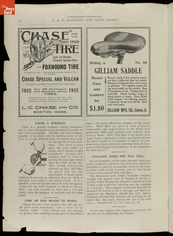 The League of American Wheelmen produced this weekly journal to promote good roads, and to highlight other issues of interest to American cyclists. This typical issue, from July 1898, contained news about the organization and its members. The journal also provided tour and safety information, poems, snapshots, and a host of bicycle advertisements for readers to enjoy.