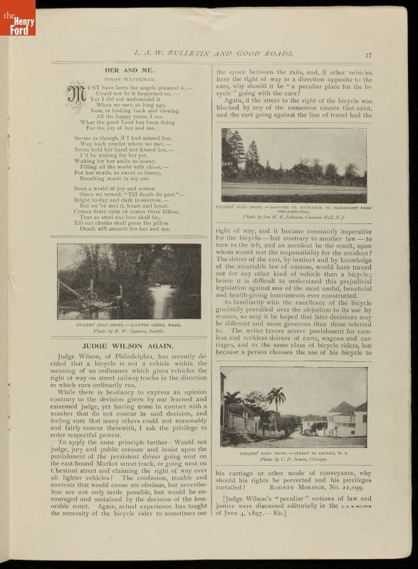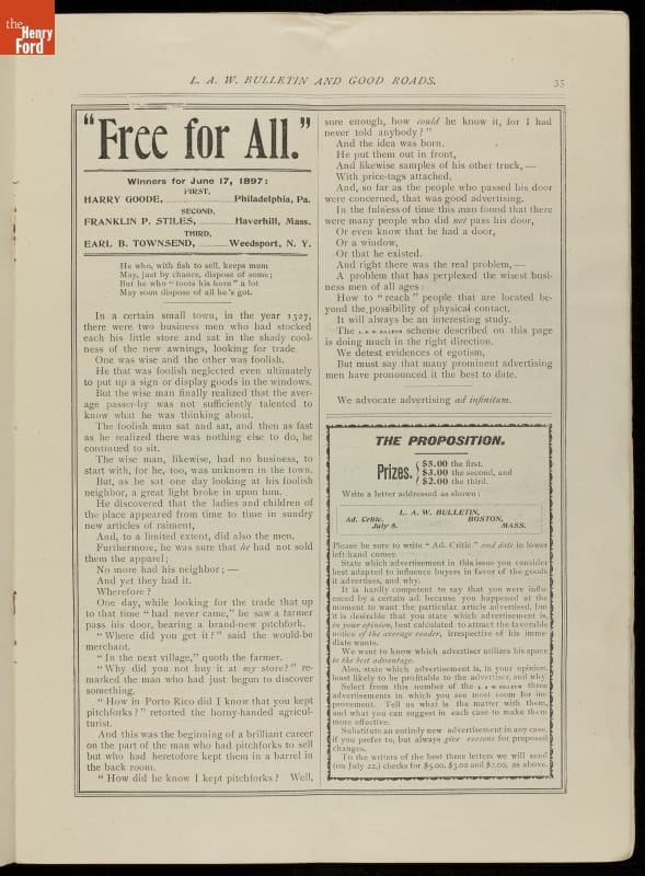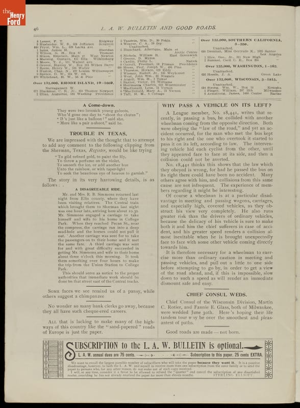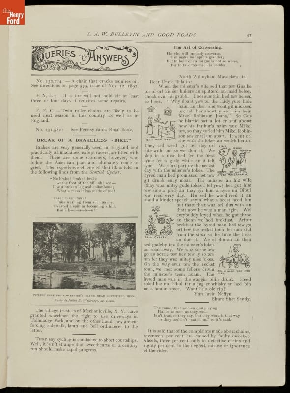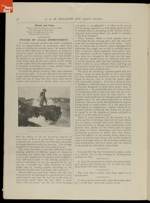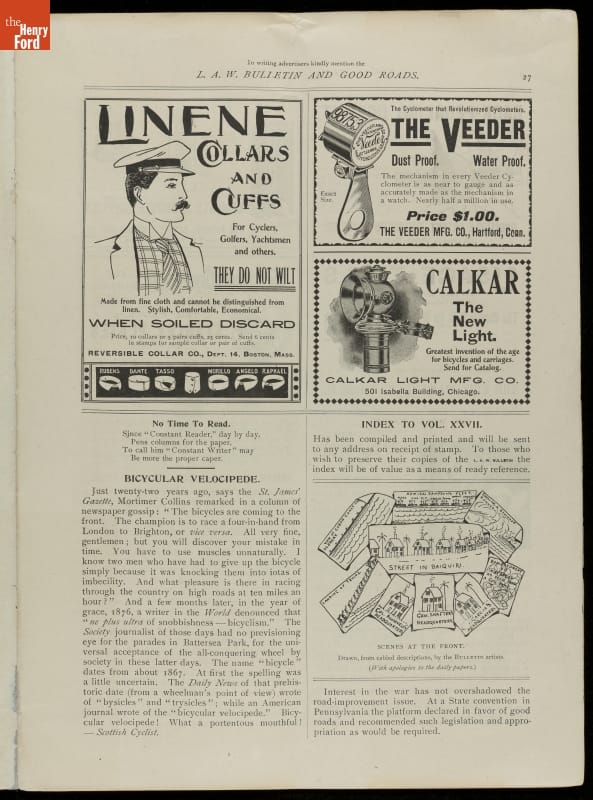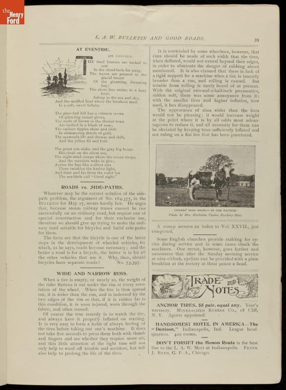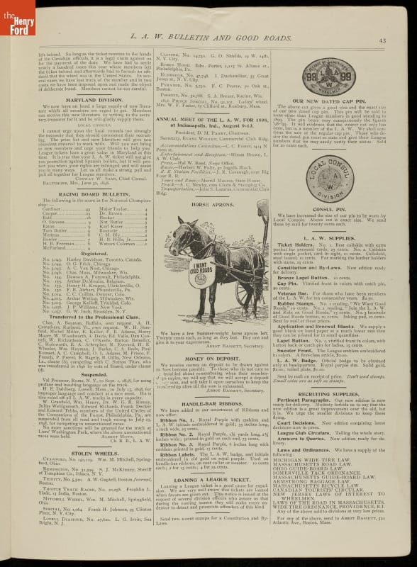 The League of American Wheelmen produced this weekly journal to promote good roads, and to highlight other issues of interest to American cyclists. This typical issue, from July 1898, contained news about the organization and its members. The journal also provided tour and safety information, poems, snapshots, and a host of bicycle advertisements for readers to enjoy.