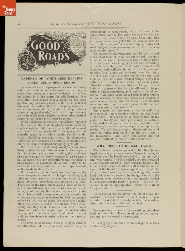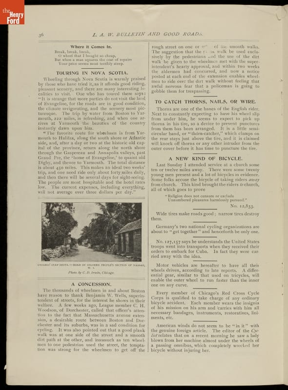 On front cover: THE / BULLETIN / AND / GOOD ROADS / OFFICIAL ORGAN / OF THE LEAGUE OF / AMERICAN / WHEELMAN / VOL. XXVIII. / Boston, July 8, 1898 / Number 2 On page 29 text reads in part: THE L.A.W. Bulletin / AND Good Roads