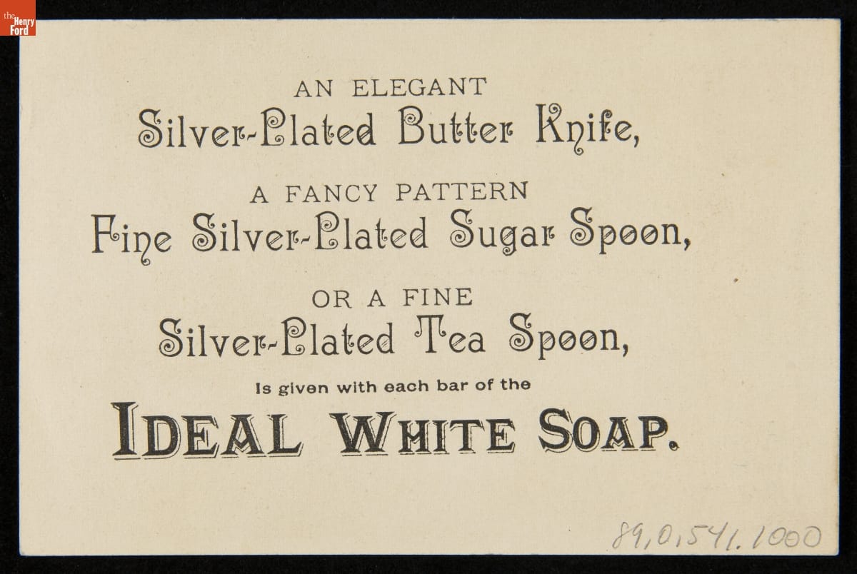 As color printing gained momentum in the late 19th century, advertisers bombarded potential customers with trade cards. Americans enjoyed and often saved the little advertisements found in product packages or distributed by local merchants. J.D. Larkin & Co.'s trade cards were known for promoting premium gifts with the purchase of a product. This card offers silver-plated utentils with the purchase of "Ideal" White Soap.
