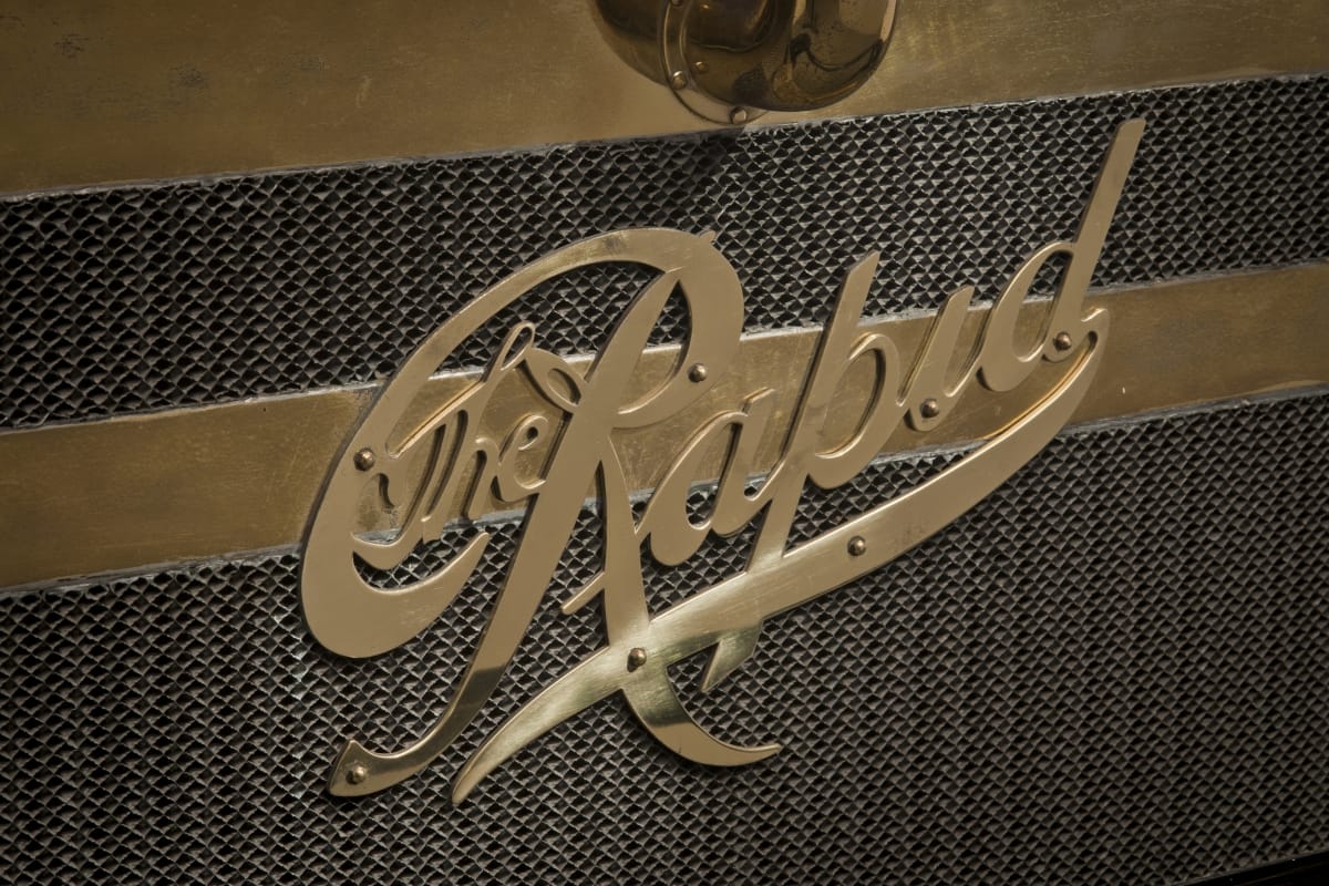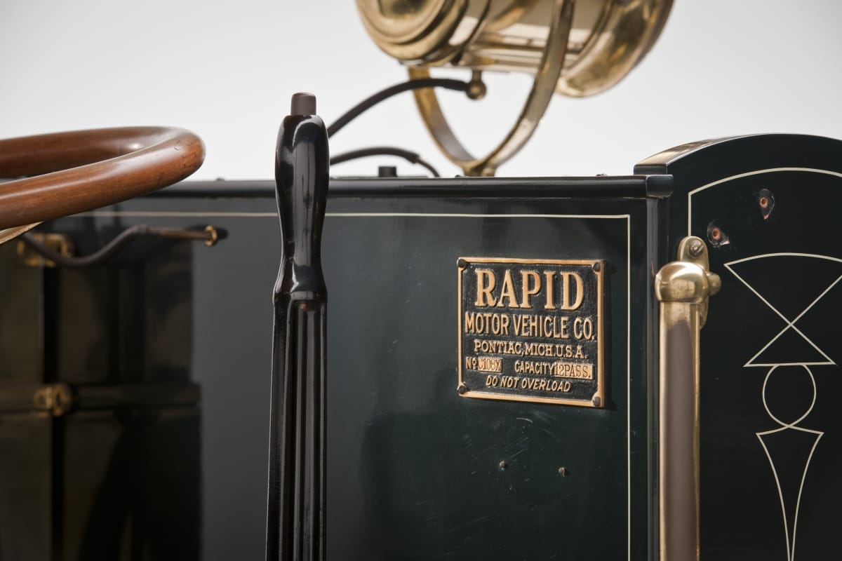 In brass script on radiator: THE RAPID Cast brass plate on dash: Rapid / Motor Vehicle Co. / Pontiac, Mich. U.S.A. / No. C108X Capacity 12 pass. / Do not overload On left front floorboard: RAPID On side of headlamps: BADGER BRASS MFG. CO / PAT. PEND / SOLAR / MODEL 41A / KENOSHA, WIS. U.S.A.