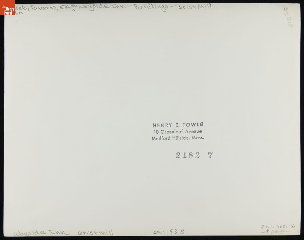 Henry Ford purchased the Wayside Inn, the setting for the poems in Henry Wadsworth Longfellow's Tales of a Wayside Inn, in 1923. Over six years, Ford spent more than $2 million restoring the inn and several adjacent buildings, including this gristmill. In retrospect, the project was something of a dry run for Ford's Greenfield Village complex a few years later.