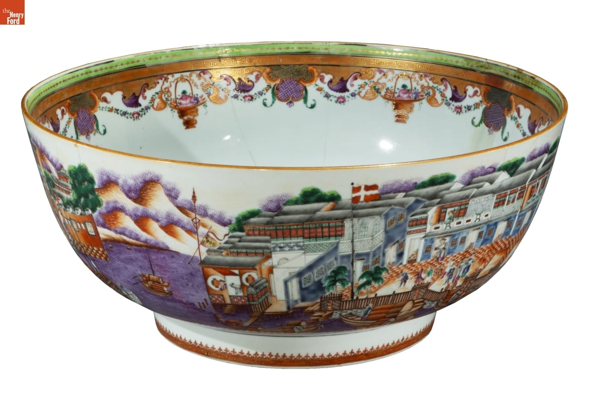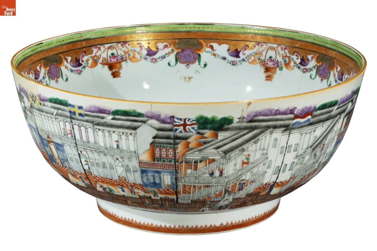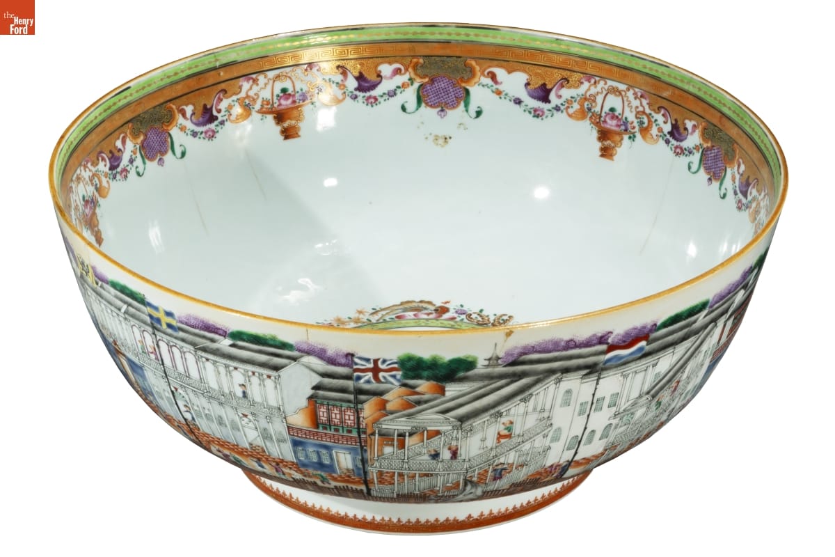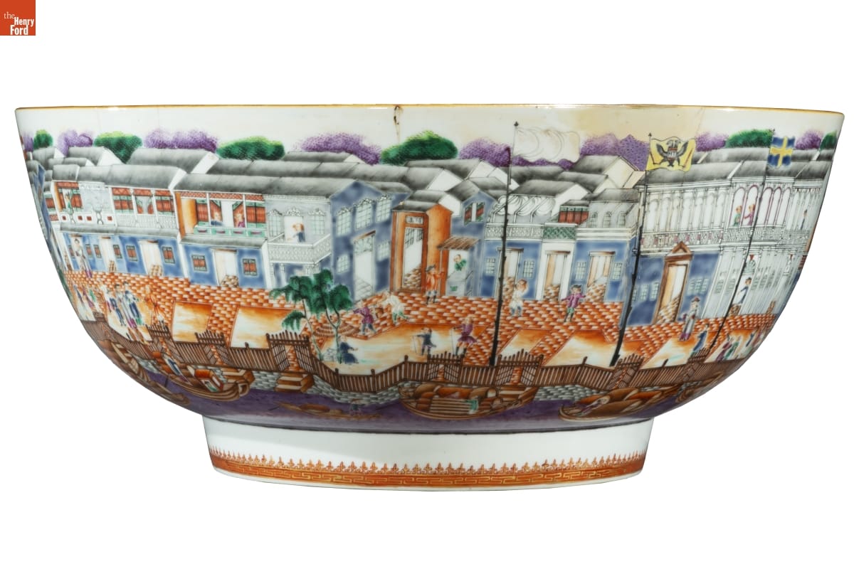 This "Hong" bowl shows a panoramic view of foreign merchants' offices, warehouses, and living spaces in Guangzhou, China, in the late 18th century. Flags of each merchant's nation fly in front of their trading offices. These merchants brought these souvenir bowls back to the West and used them for serving punch. Potters produced this bowl before the newly independent United States established trade with China.