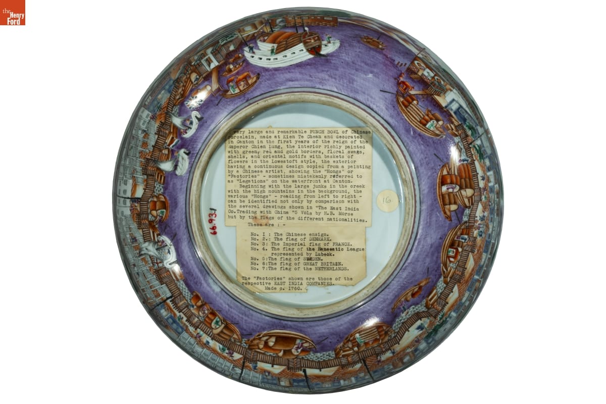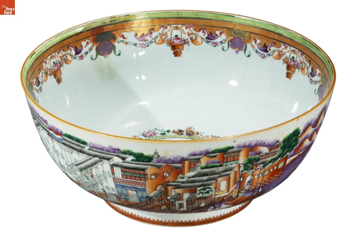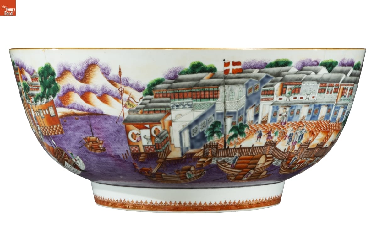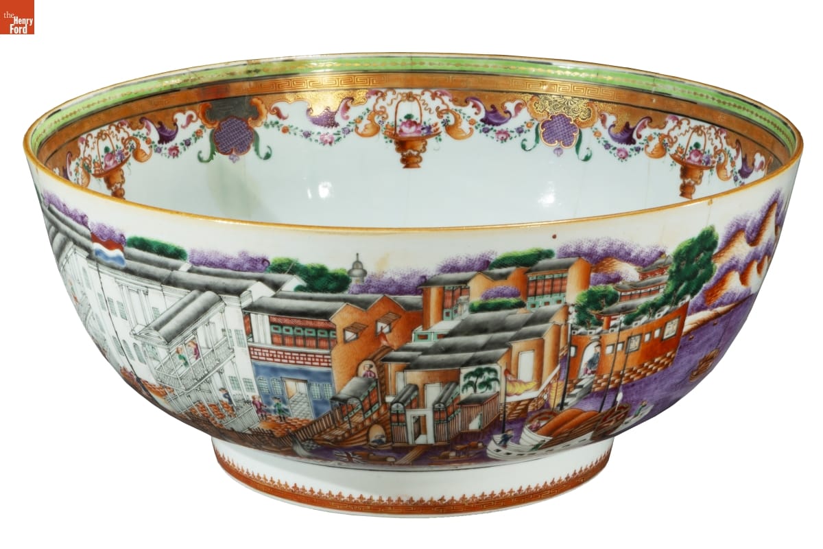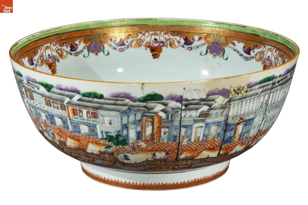 This "Hong" bowl shows a panoramic view of foreign merchants' offices, warehouses, and living spaces in Guangzhou, China, in the late 18th century. Flags of each merchant's nation fly in front of their trading offices. These merchants brought these souvenir bowls back to the West and used them for serving punch. Potters produced this bowl before the newly independent United States established trade with China.
