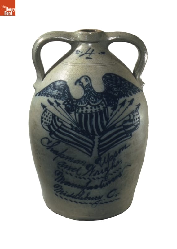 This jug was made of a durable, leak-proof pottery called stoneware, shaped on a potter's wheel. The orange-peel-like outer glaze was created when the potter threw handfuls of common rock salt into a white-hot kiln during the piece's firing. Salt-glazed stoneware pieces were decorated with an amazing array of designs, including the patriotic motifs on this piece.