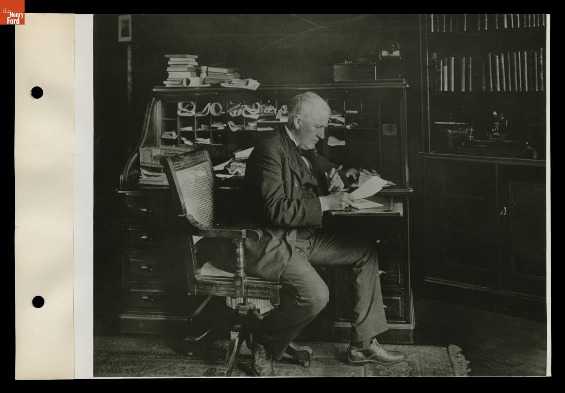 This photograph shows prolific inventor and American entrepreneur Thomas Edison around age 60. By this time, Edison had invented and built entire industries around the phonograph, the incandescent electric lamp, and the Kinetoscope. Though he continued important work at his vast West Orange, New Jersey, laboratory and elsewhere, Edison was beginning to oversee fewer of his companies' daily operations.