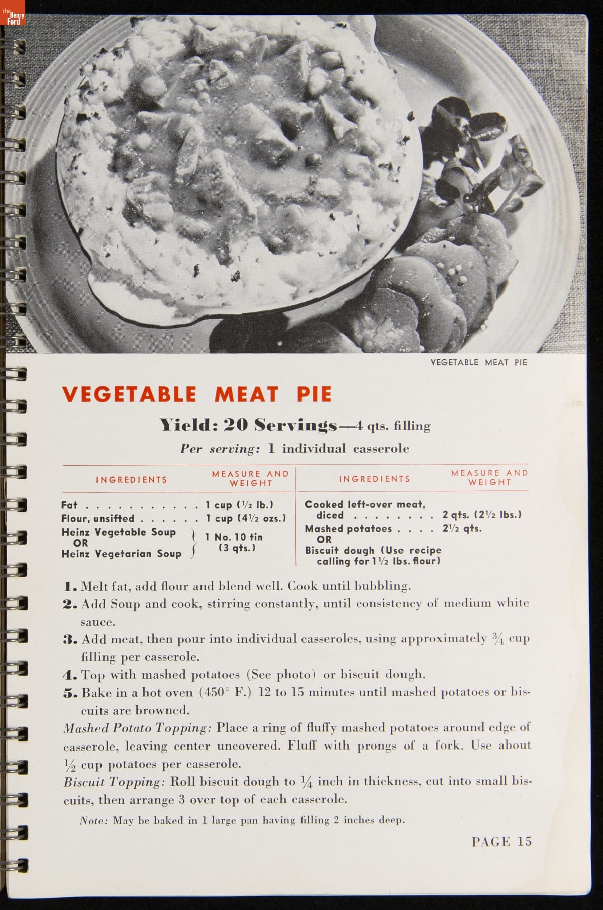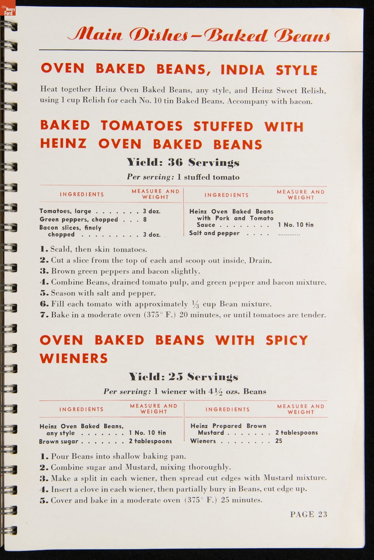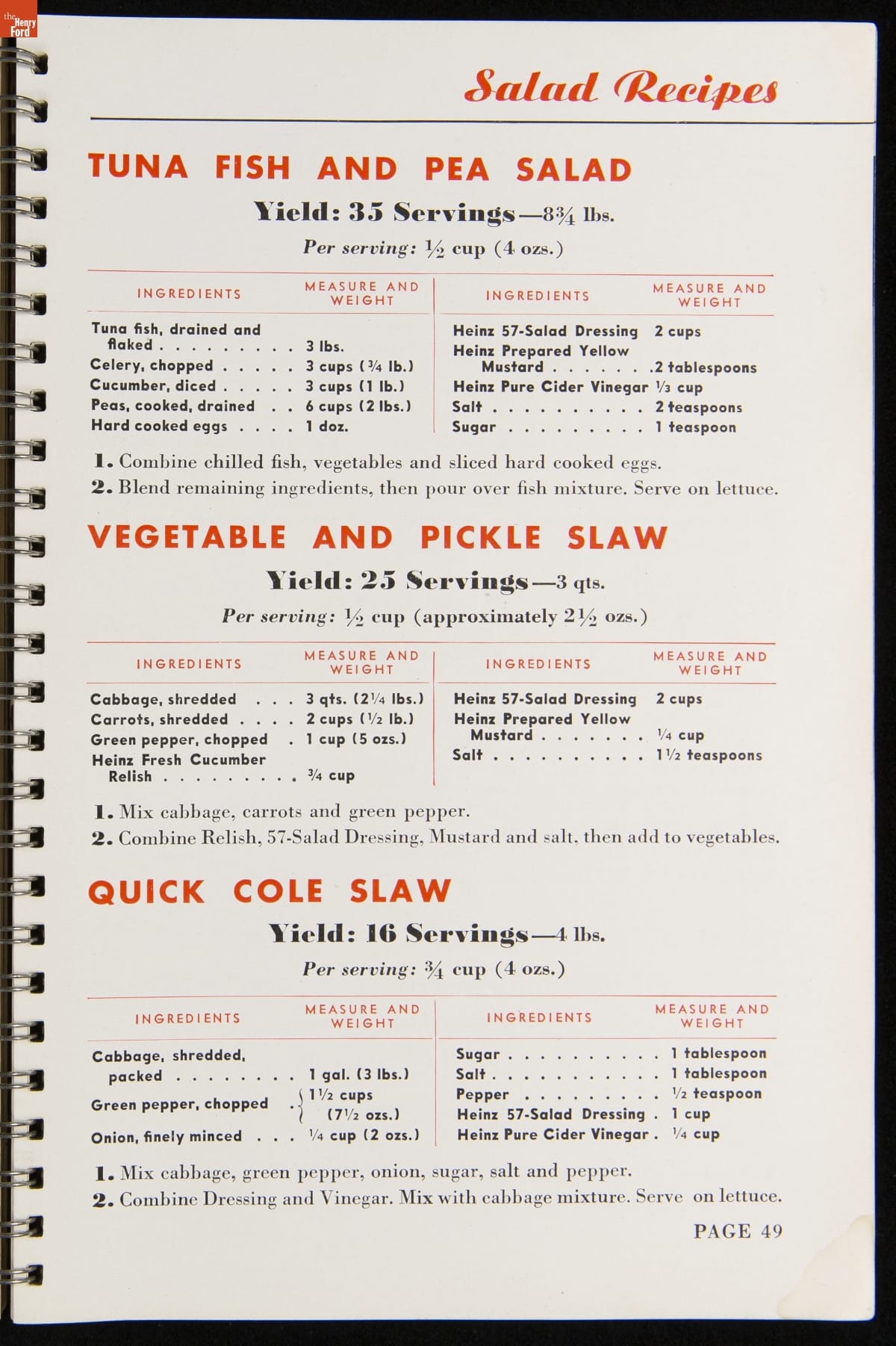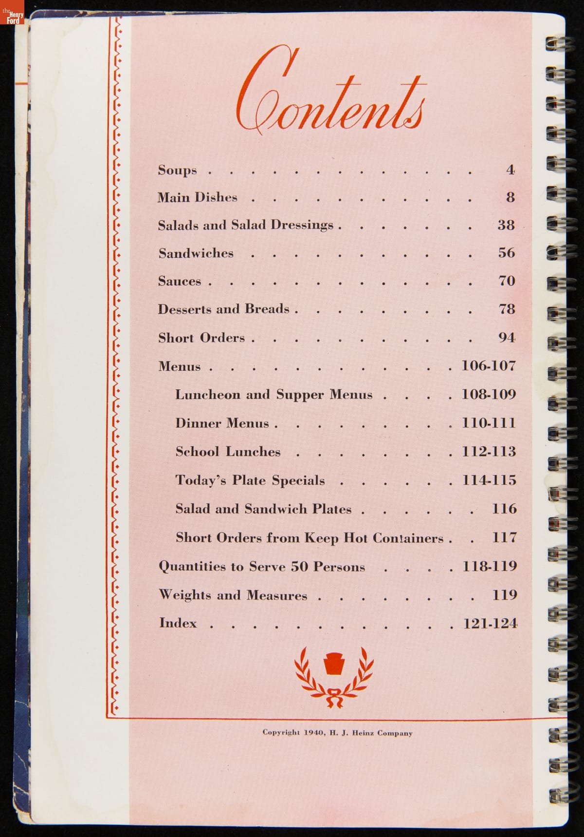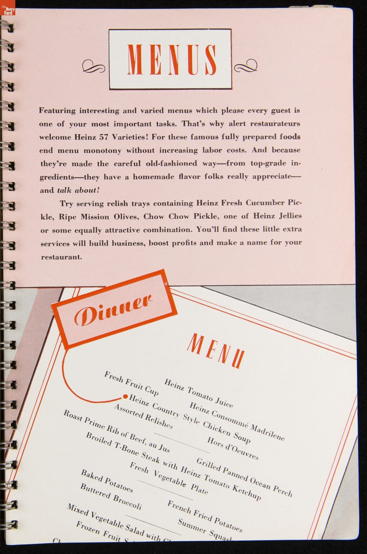 Recipe booklets and cook books can be general or specific in the range and type of food featured within their pages. Like other manufactured food companies, the H.J. Heinz Company published recipe booklets which featured recipes using their products. This recipe booklet from 1940 provides recipes to serve a large number of guests, including full menu suggestions, utilizing Heinz products.