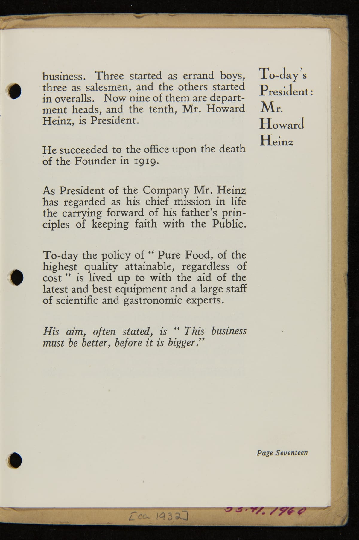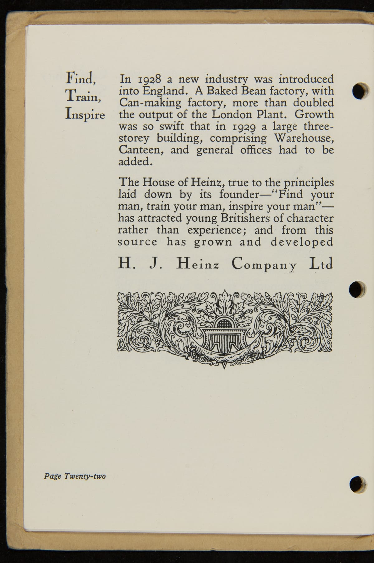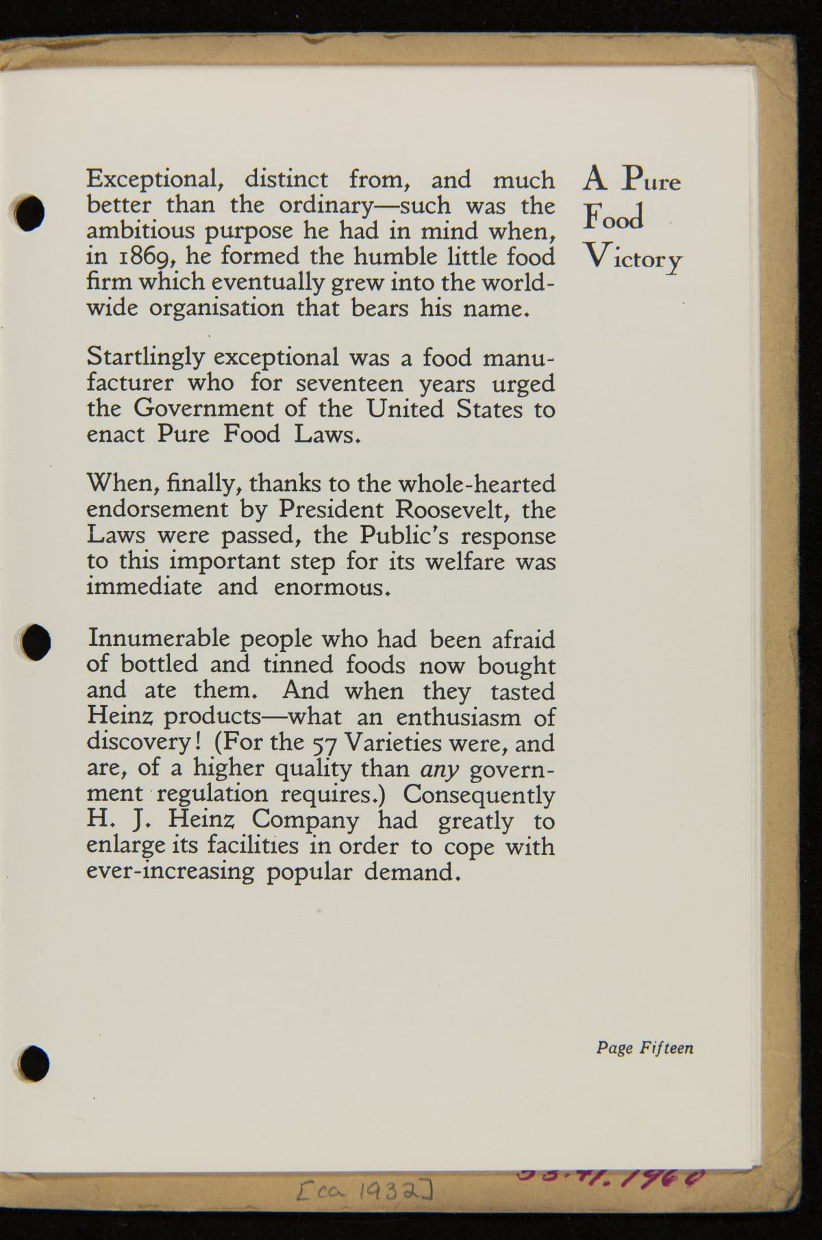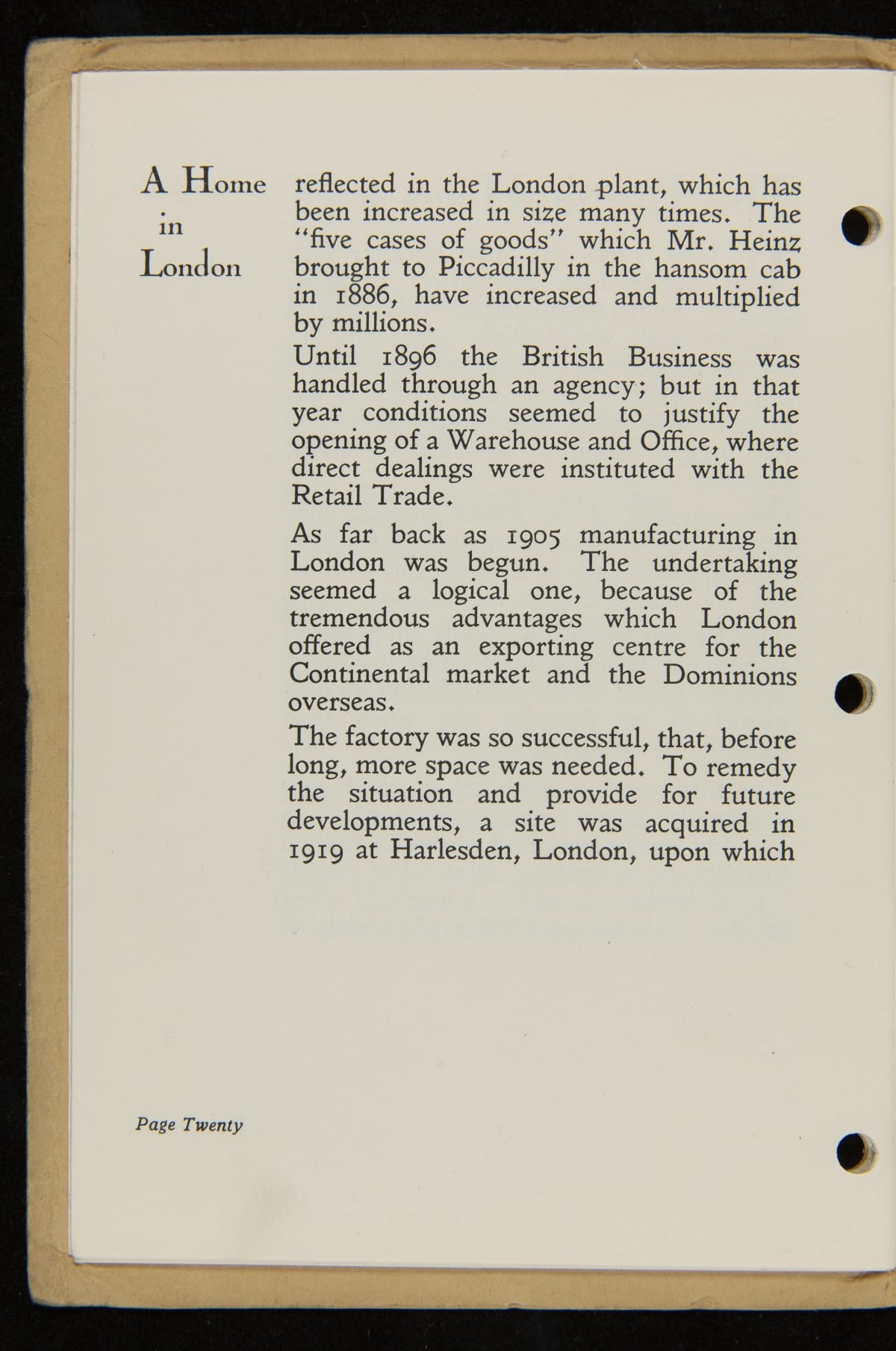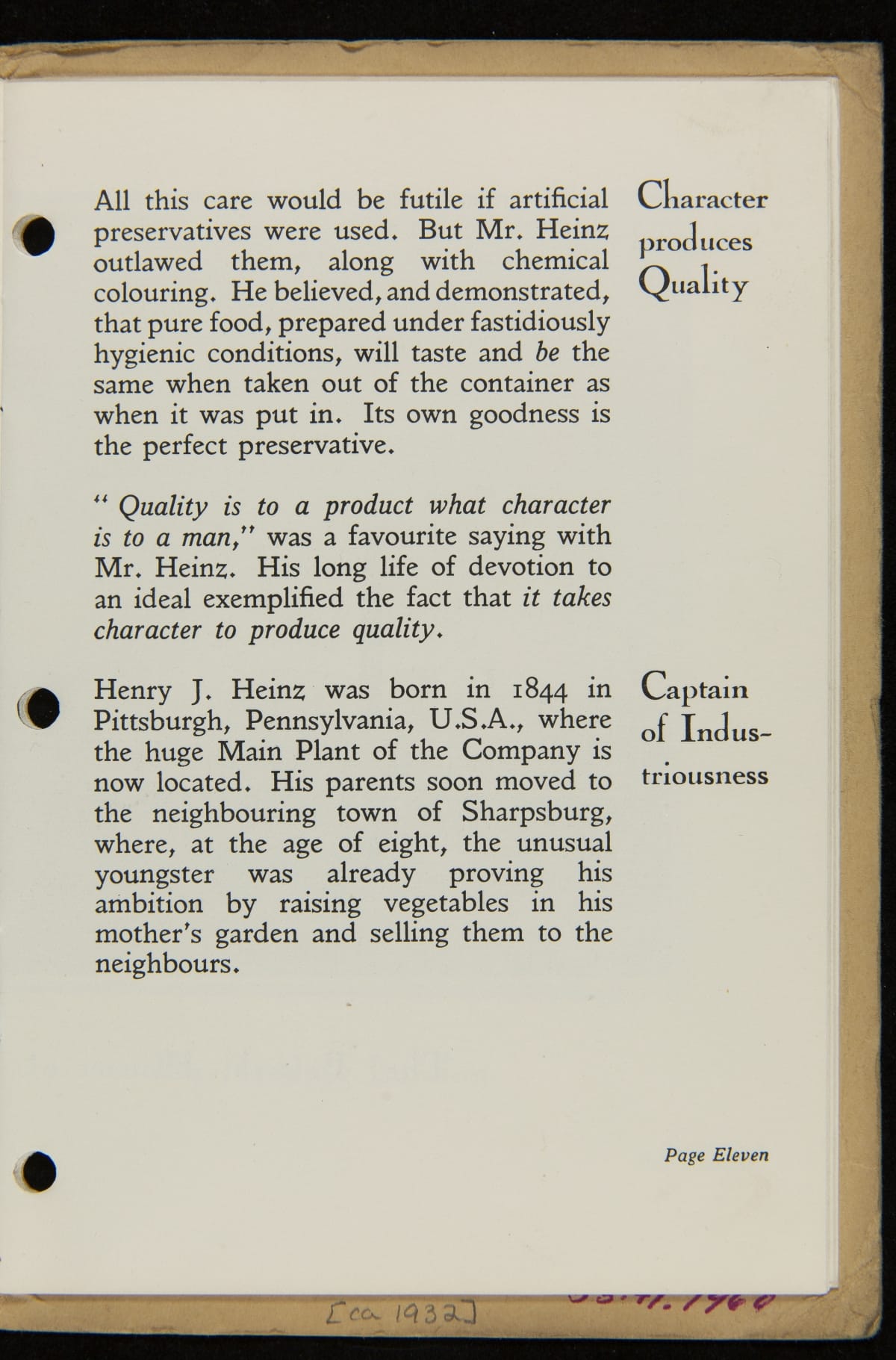 H.J. Heinz built his business from the ground up, skillfully employing his principles and ideals to create one of the most successful companies in the manufactured food industry. This booklet, printed for British audiences, highlights the H.J. Heinz Company's history -- and its history of factories in Great Britain -- with an emphasis on the company's pure and clean practices.