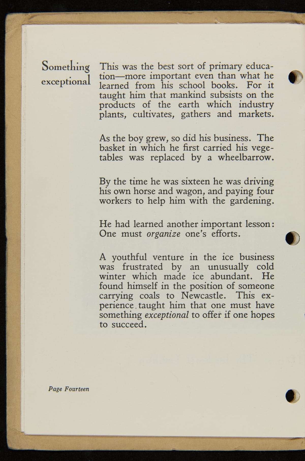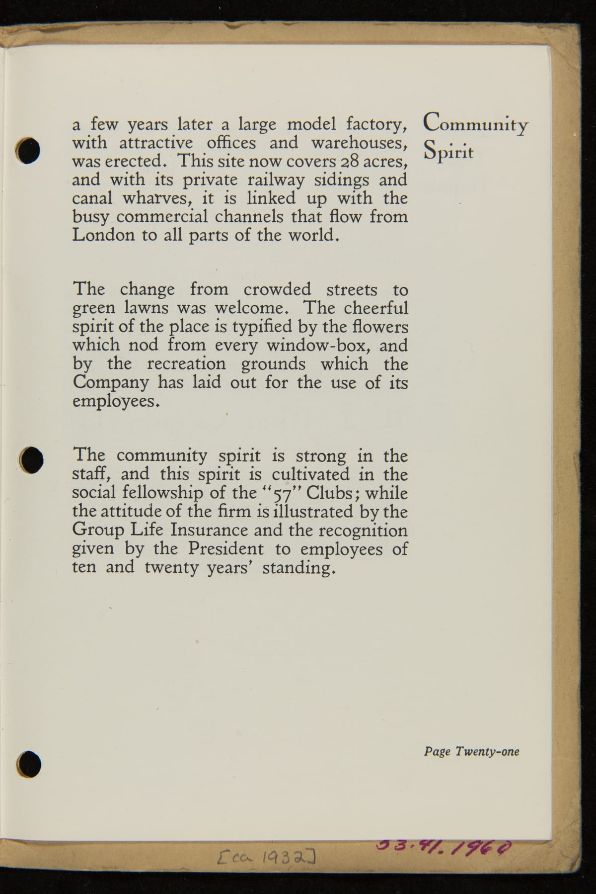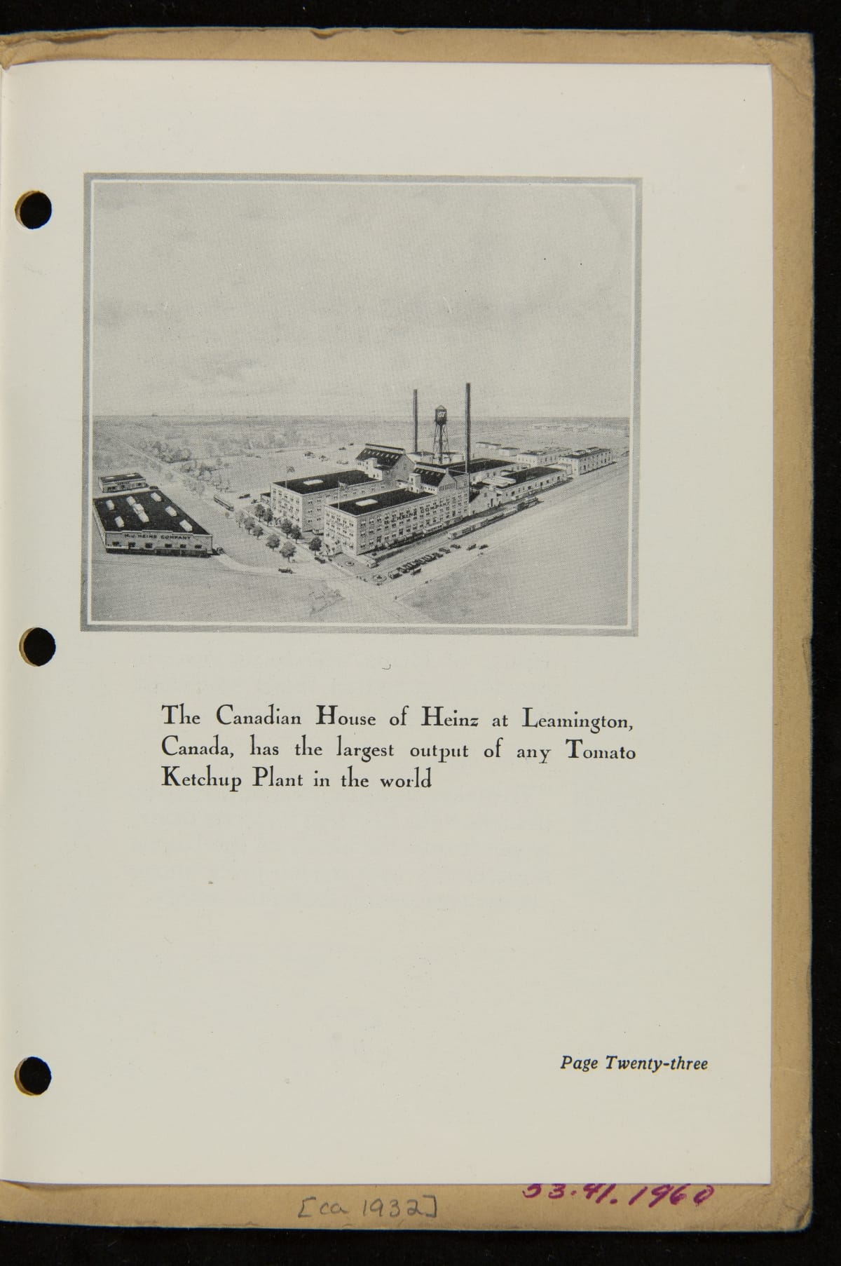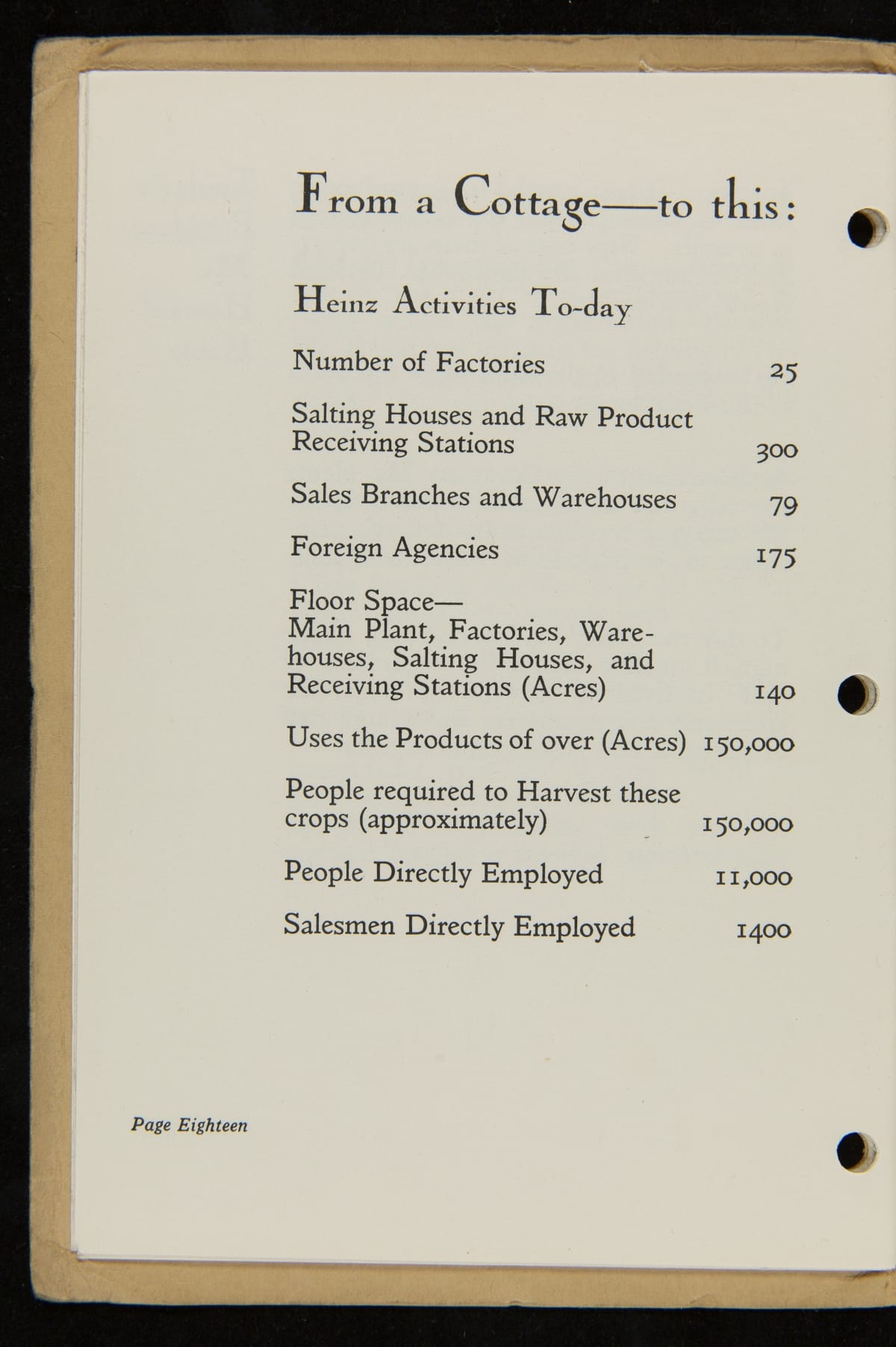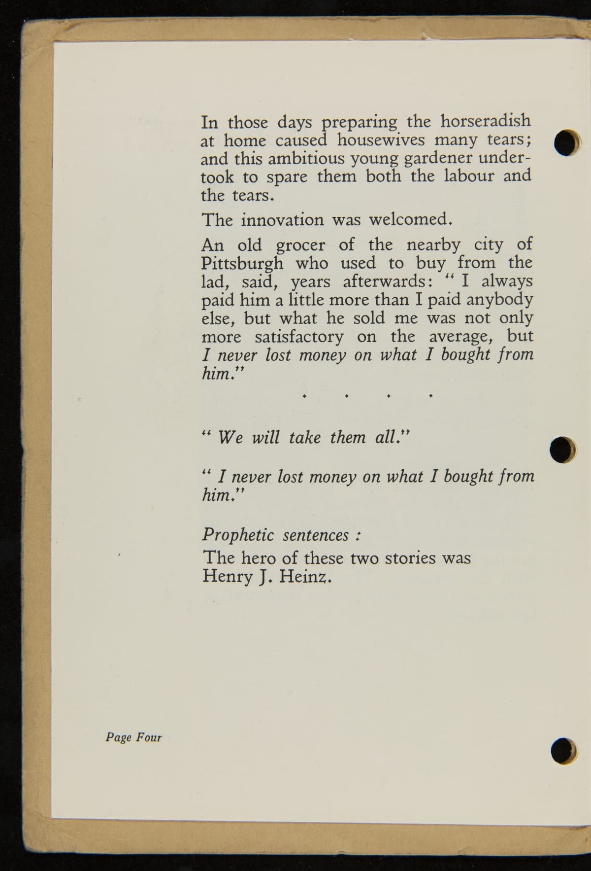 H.J. Heinz built his business from the ground up, skillfully employing his principles and ideals to create one of the most successful companies in the manufactured food industry. This booklet, printed for British audiences, highlights the H.J. Heinz Company's history -- and its history of factories in Great Britain -- with an emphasis on the company's pure and clean practices.