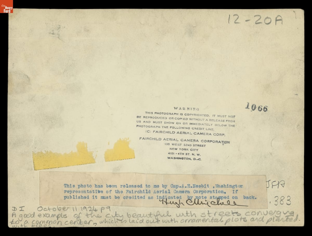 Sherman Fairchild worked to advance aerial photographic technology during World War I. After the war, he founded an influential commercial aerial survey company. A savvy promoter, Fairchild touted the value of aerial views for urban planning. Several major cities commissioned him to produce images like this one taken over Washington, D.C. Fairchild's photographs remain important documents of 20th-century patterns of urbanization.