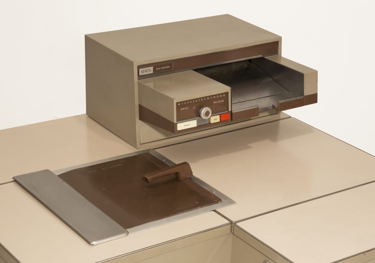 The Xerox 914 was the first commercially successful automatic office copier. Using Chester Carlson's xerography process, documents were produced electrostatically, using powdered toner. This copier weighed 650 pounds and made one copy every 26 seconds on paper up to 9 x 14 inches. The 914 also came with a "scorch eliminator" -- a small fire extinguisher for taming fires caused by overheating.