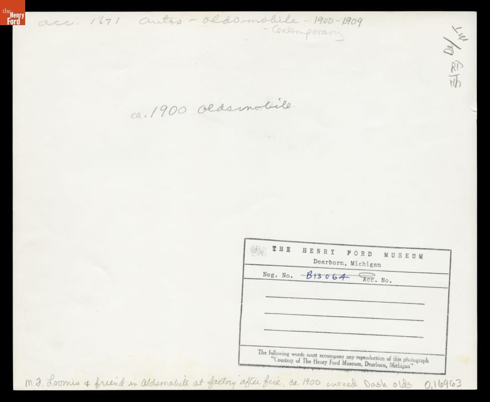 Engineers M. S. Loomis and C. Wilson in Curved-Dash Oldsmobile outside Olds Motor Works Factory, Detroit, Michigan, 1901