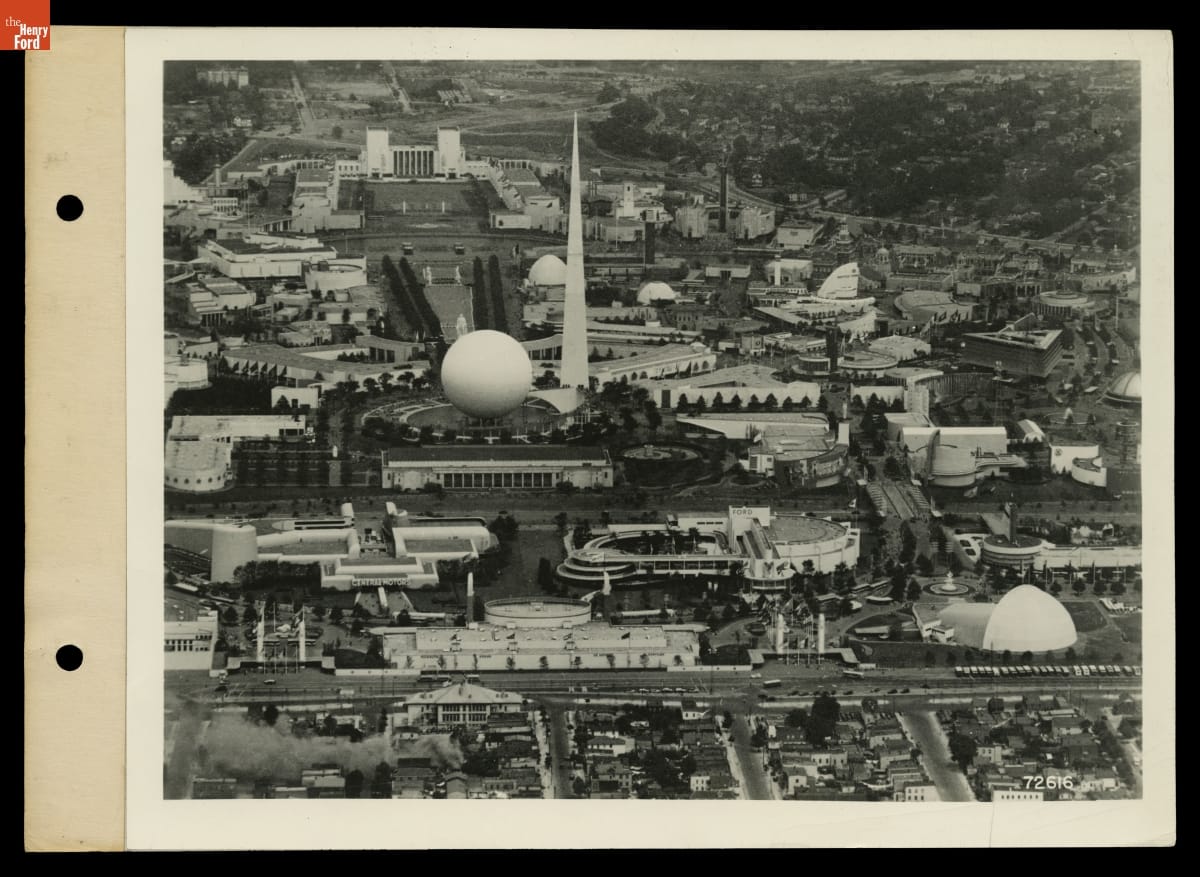 This November 2, 1939 Ford Motor Company photograph shows an aerial view of the New York World's Fair. The Ford Motor Company building appears in the second row of buildings, with its signature circular, tiered "road of tomorrow" flanking its left side. The central Trylon and Perisphere dominate the scene.