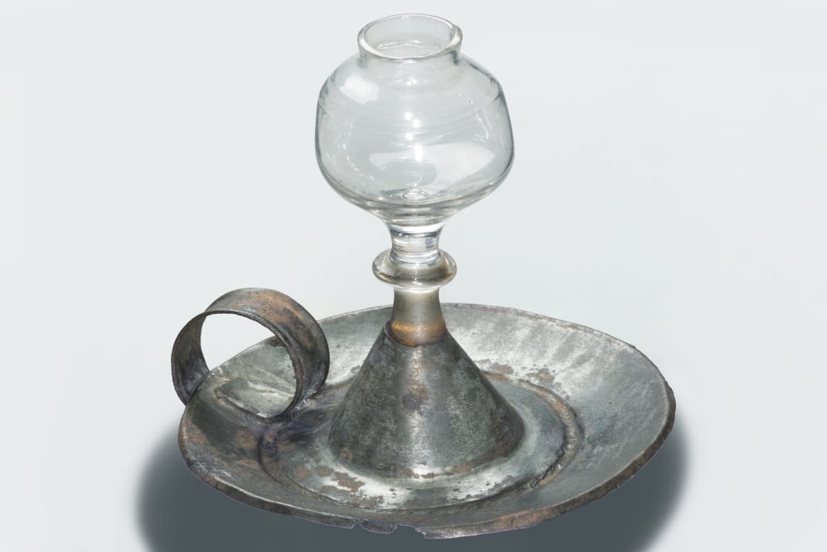 Traditional make-dos are useful and precious objects that broke during their working lives. Their owners felt compelled to restore or repurpose these objects in a variety of ways. The glass base of this lamp broke and it was given a new base made of tin.