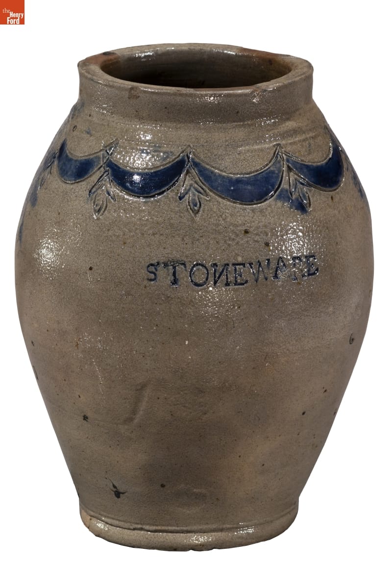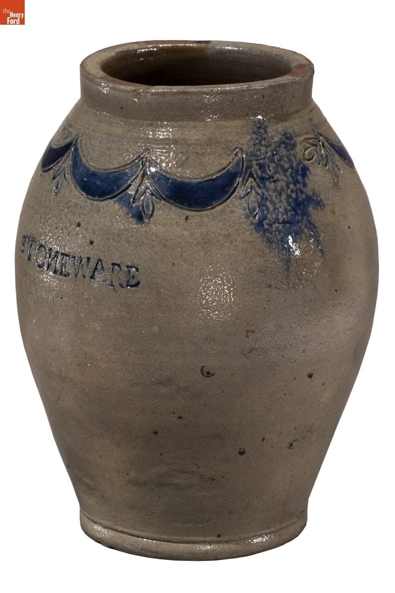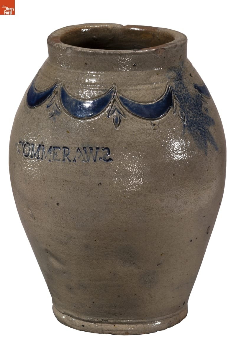 Thomas Commeraw, a free African American potter and entrepreneur, produced salt-glazed stoneware in the Corlears Hook neighborhood of New York City from 1791 to 1819. These stoneware jars and crocks were durable and helped preserve food for storage in cool cellars and ice houses. Commeraw's distinctive stoneware typically contains cobalt blue swags and tassel decoration.